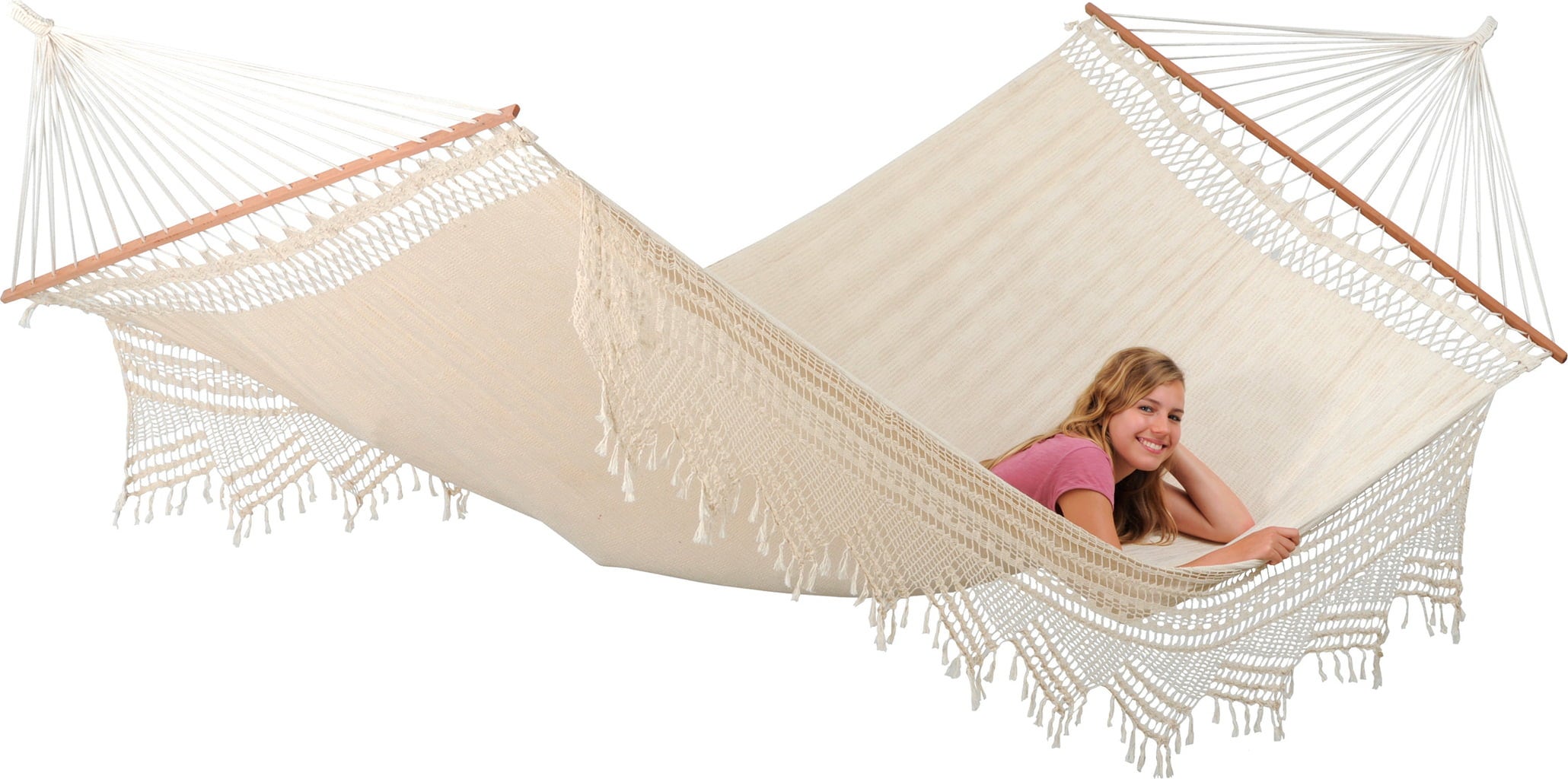 De mooie, met de hand geknoopte sierrand en het verdere macramé handwerk tussen de hangmatstof en de houten palen geven de hangmat zijn prachtige design, terwijl een unieke jacquard weeftechniek zorgt voor een bijzonder hoog comfort. De stevige hardhouten spreidstangen geven de hangmat stabiliteit, terwijl dikke koorden, die met de hand zijn verbonden met een geweven band, eventuele stresspunten voorkomen.