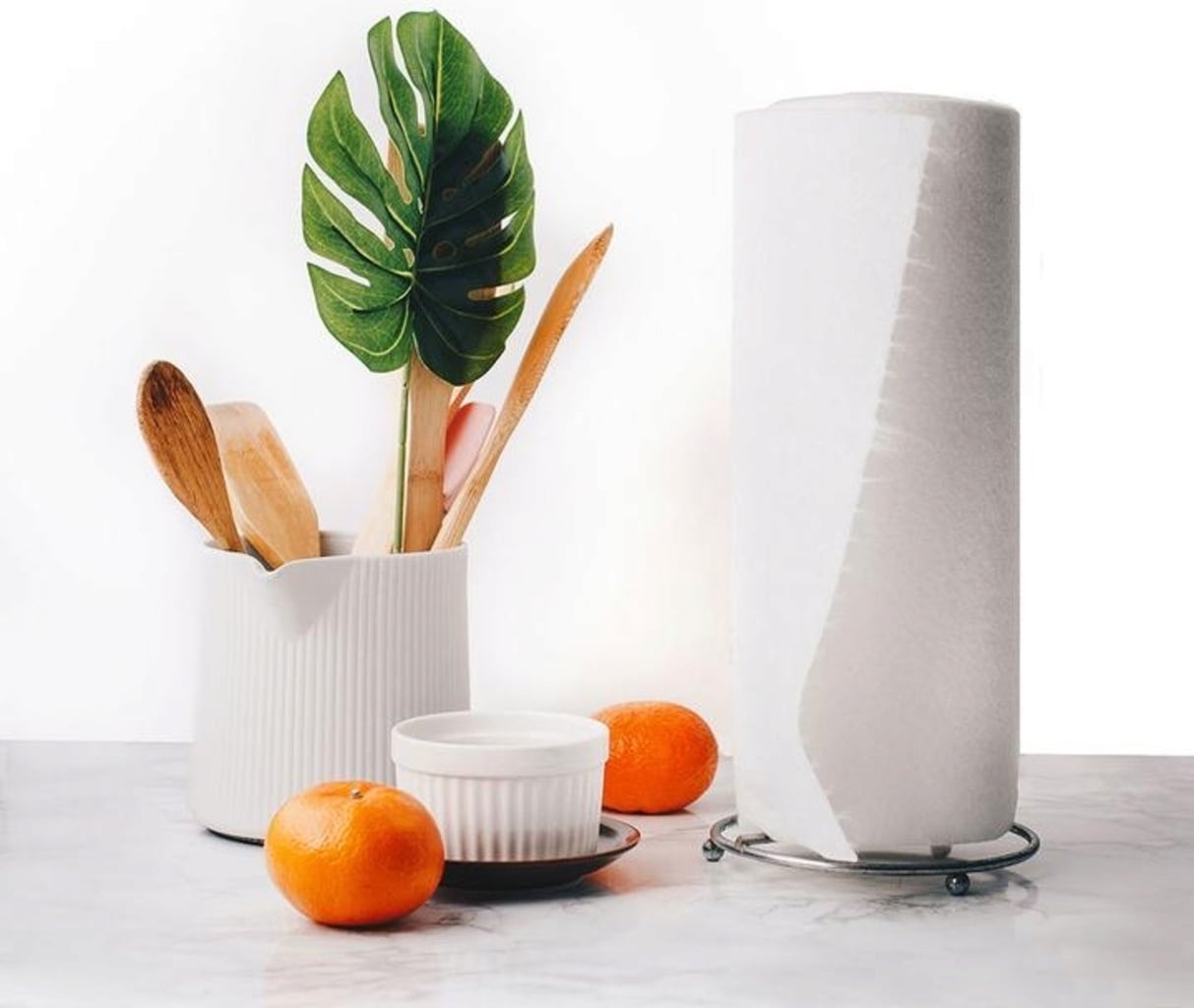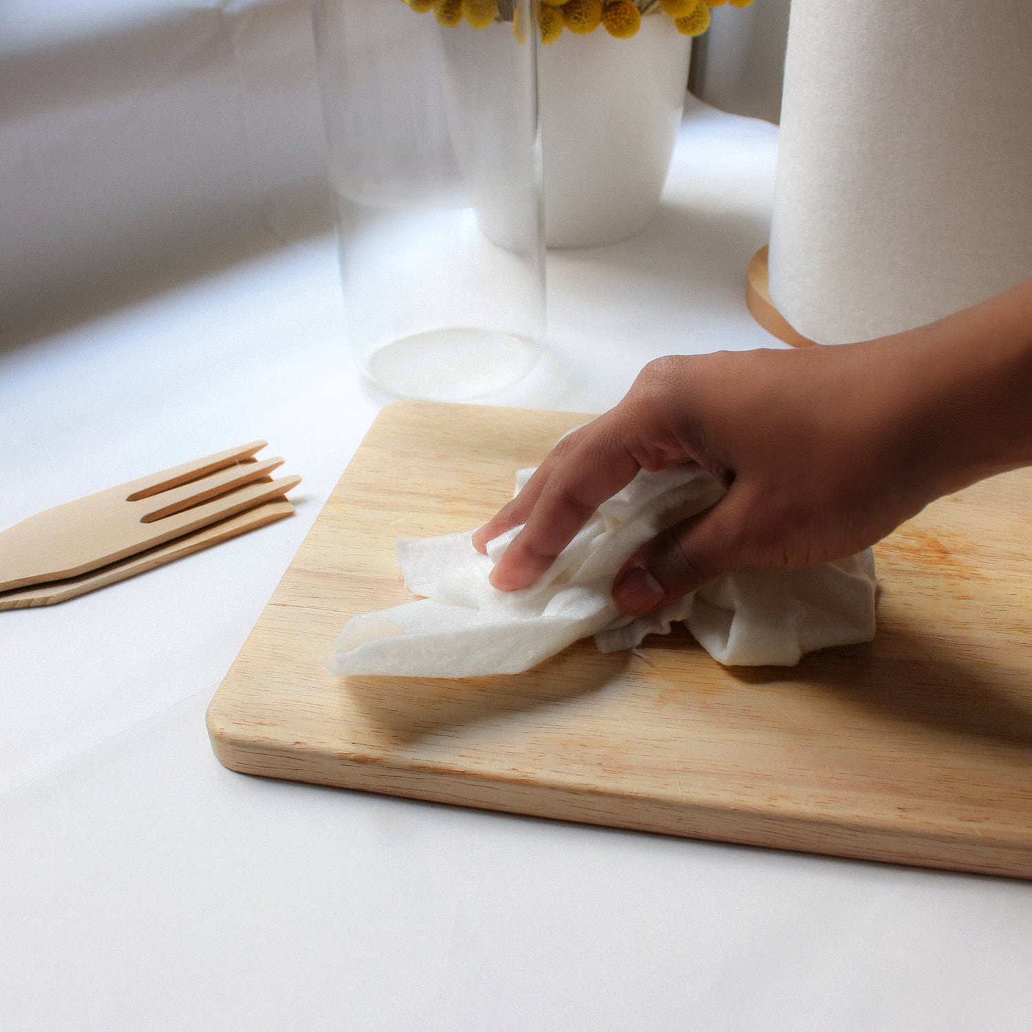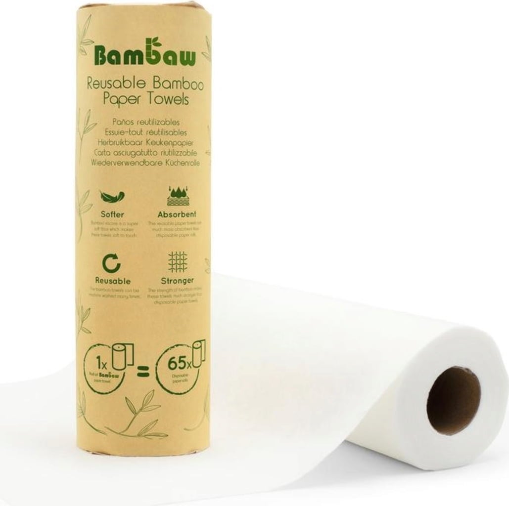 Een rol bamboe keukenrol met 20 vellen vervangt 65 wegwerp keukenrollen. De bamboe keukenrol is veel absorberender dan conventionele keukenrollen en reinigt oppervlakken grondig en moeiteloos. De keukendoeken zijn gemaakt van 20% polyester en 80% bamboe, ze zijn zeer duurzaam en kunnen gemakkelijk worden gewassen en hergebruikt.