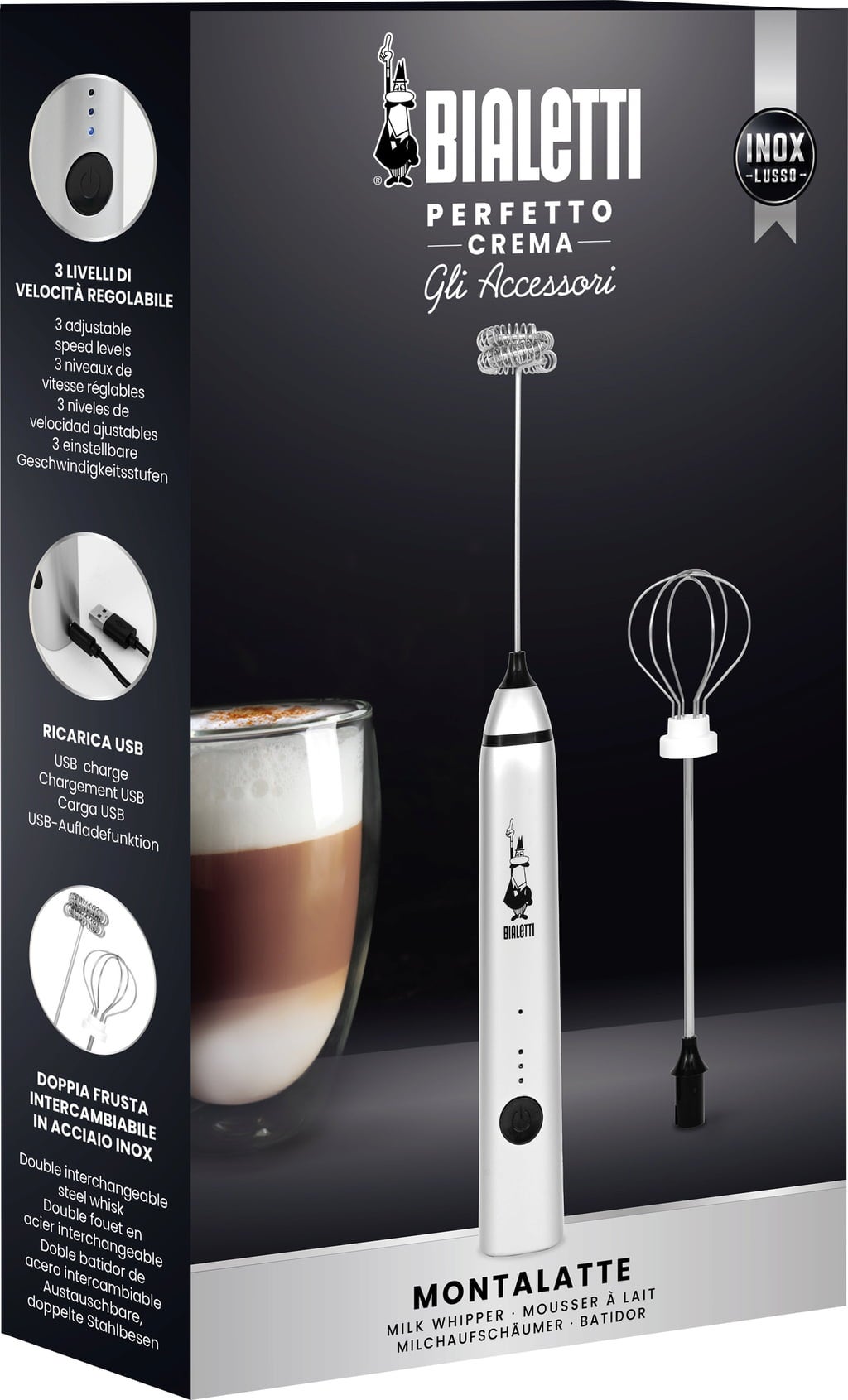 Bialetti Staaf Melkopschuimer met twee Opzetstukken en USB-aansluiting, Zilver