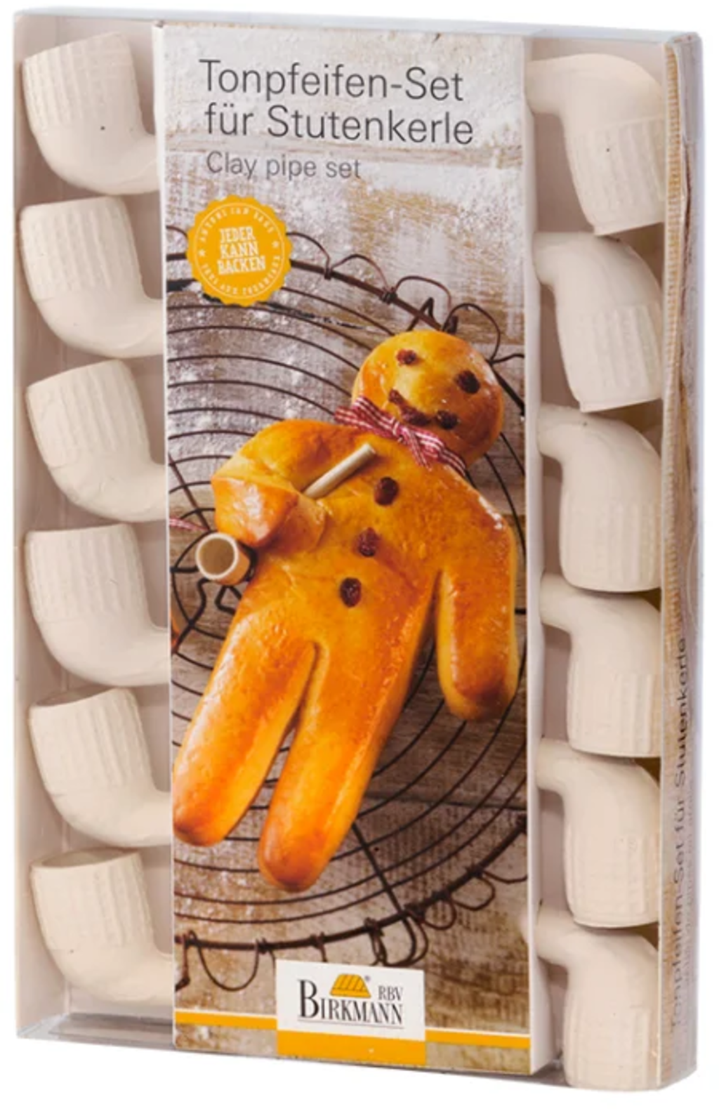 Met deze traditionele decoratieve pijpjes geef je je zelfgebakken Stutenkerl een klassieke, authentieke uitstraling. De pijpjes zijn 8 cm lang, gemaakt van ovenvaste klei en hittebestendig tot 230 °C – dus perfect om mee te bakken in de oven.