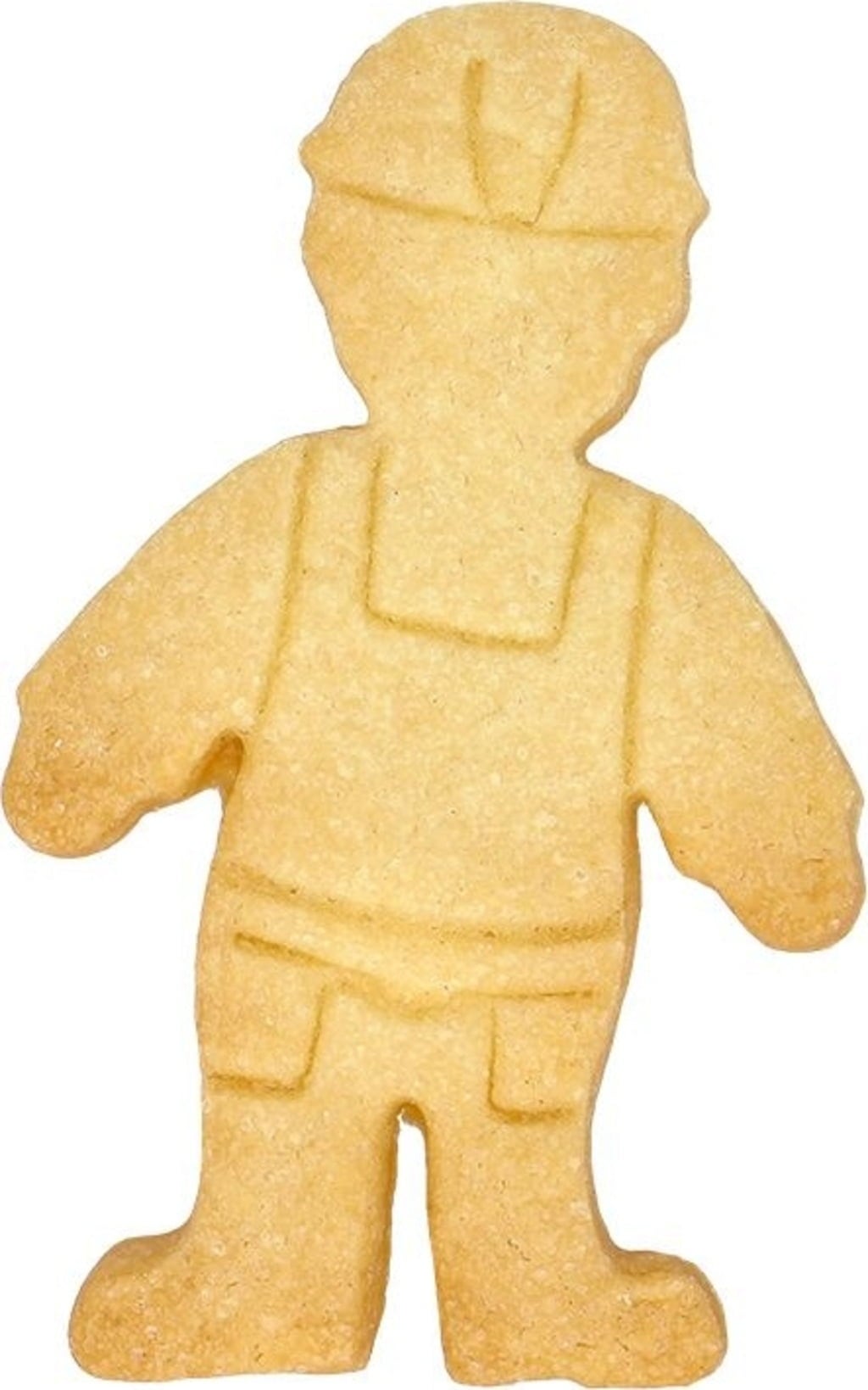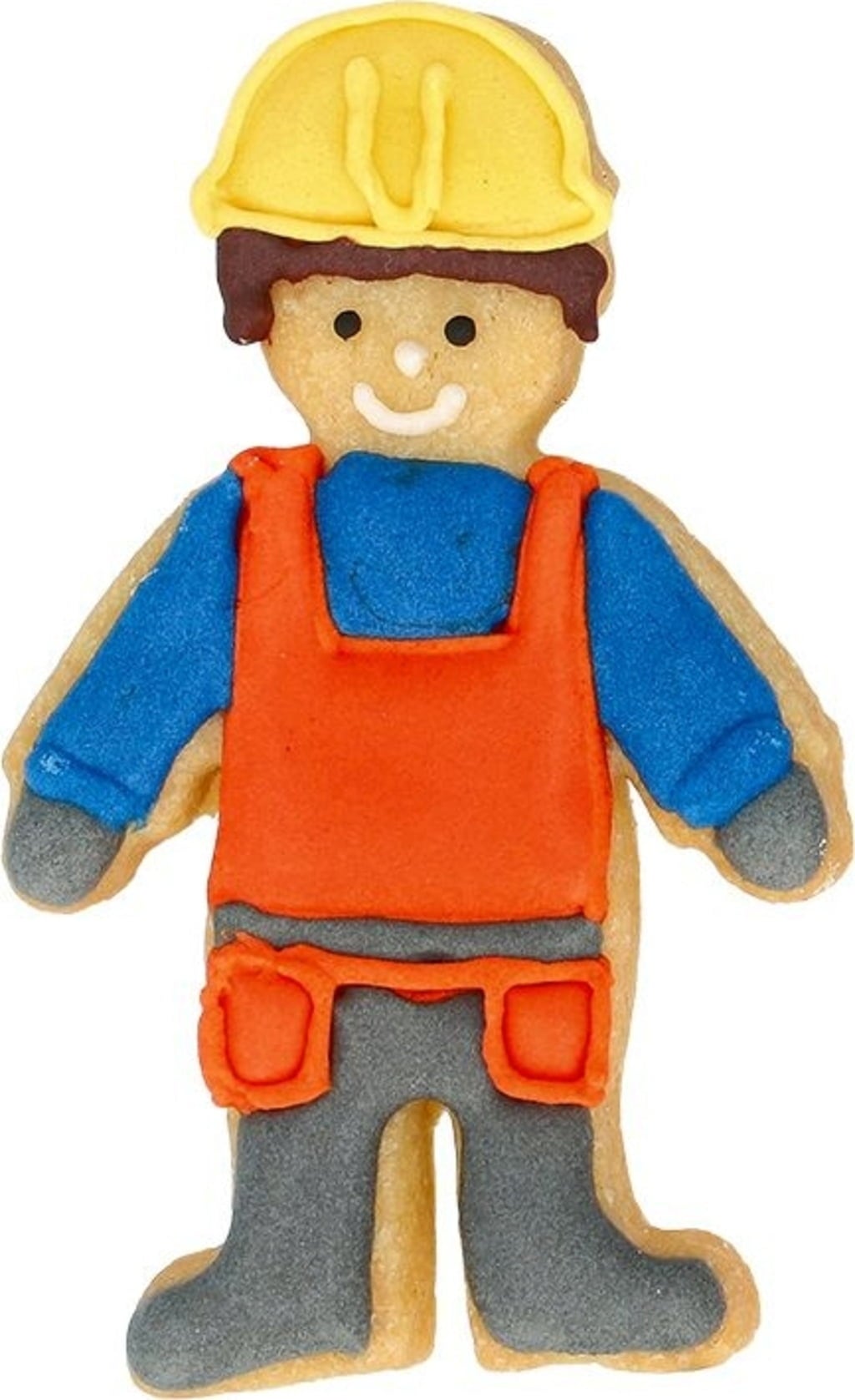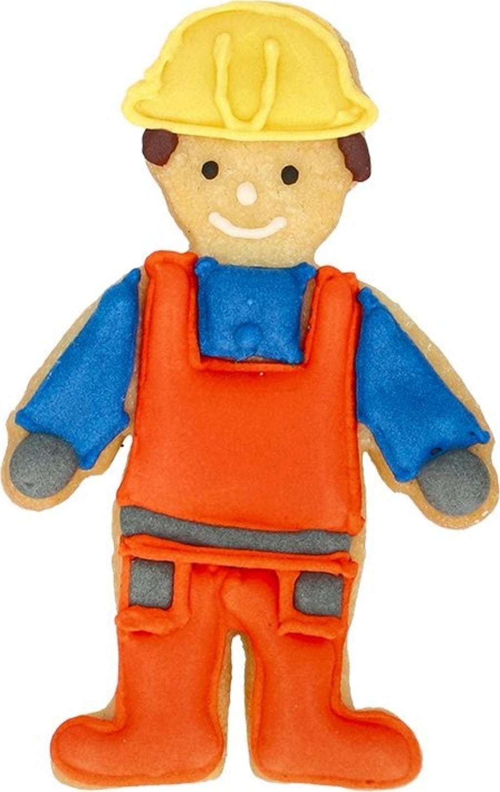 Gedetailleerde koekjesuitsteker van roestvrij staal met decoratief reliëf aan de binnenkant. De vrolijke bouwvakker kijkt er naar uit om individueel te worden gedecoreerd en verfraaid.