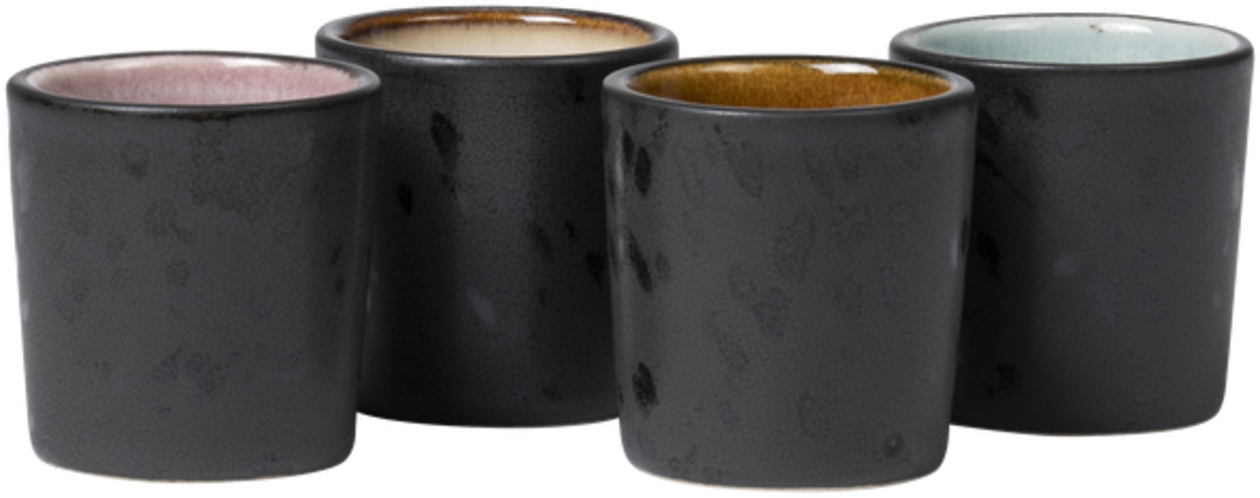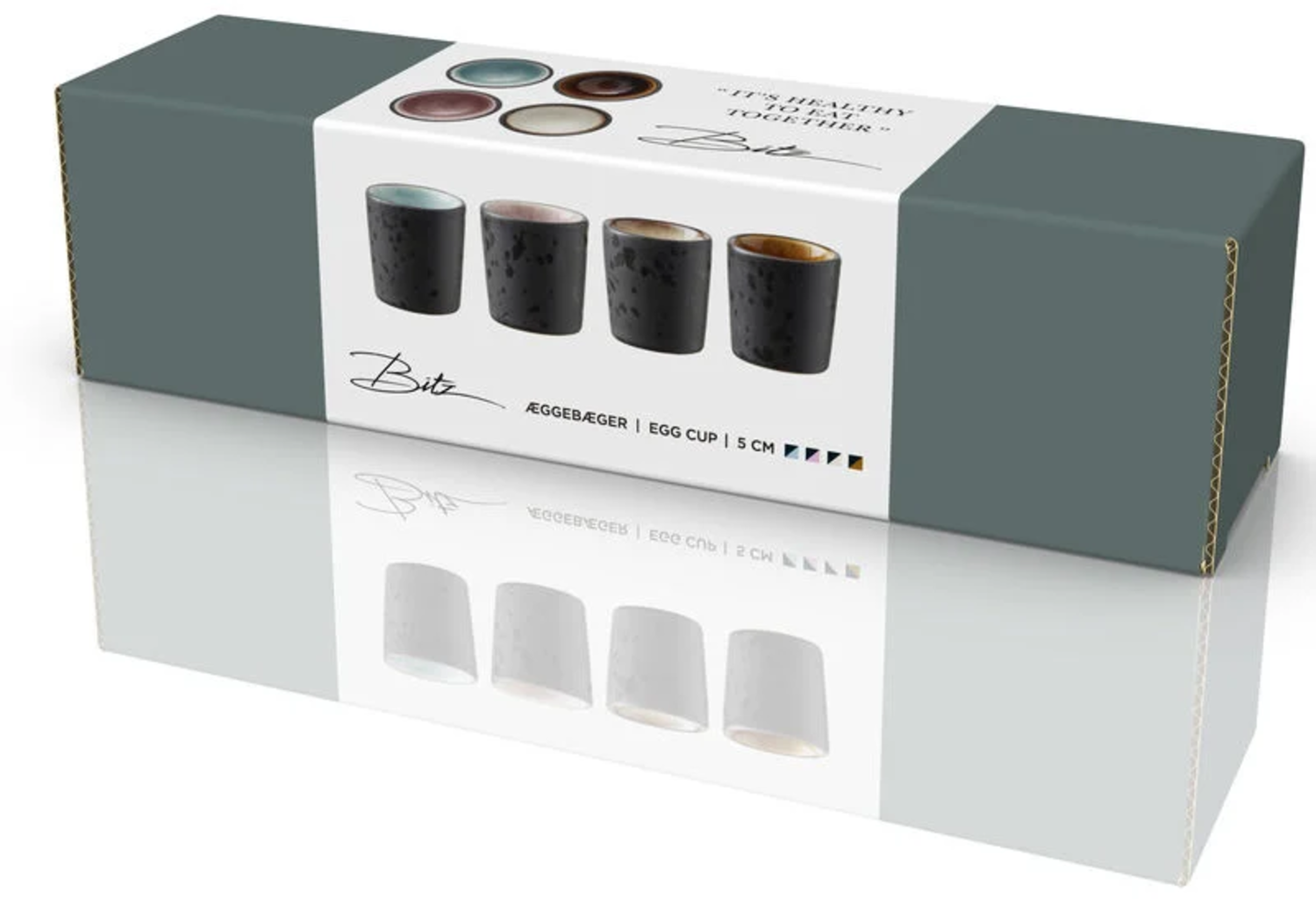 Een perfect gekookt eitje verdient ook het perfecte kopje. Verras je geliefden tijdens de brunch en serveer je gekookte eitjes in de stijlvolle eierdopjes van Bitz. De buitenkant is van mat zwart steengoed, terwijl de binnenkant glanst met glazuur. Elke beker heeft een andere kleur aan de binnenkant, waardoor een kleurrijke maar harmonieuze mix ontstaat: amber, lichtroze, crème en lichtblauw.