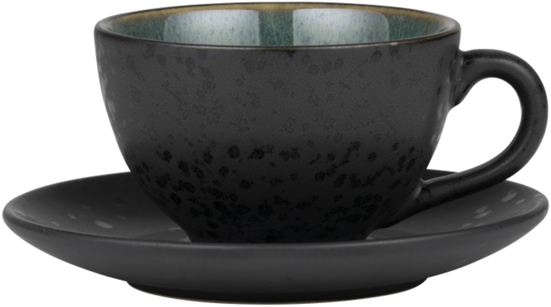 Geniet van je Americano, cappuccino of een van je andere koffie-favorieten in de prachtige koffiemok van Bitz. De mok is met de hand gemaakt van mat zwart steengoed met een glanzend groen glazuur aan de binnenkant en heeft een bijzonder uniek, modern ontwerp.