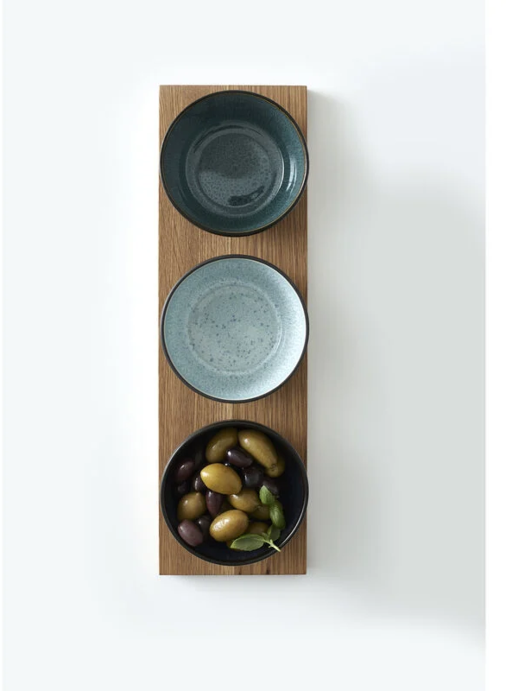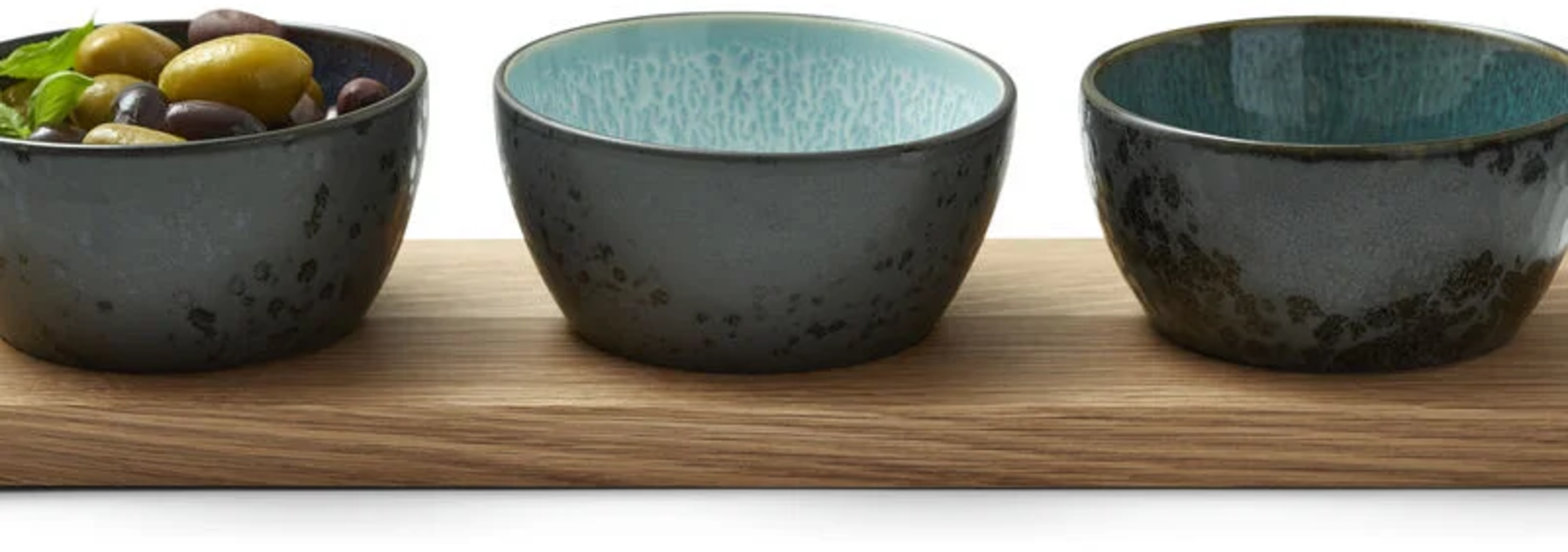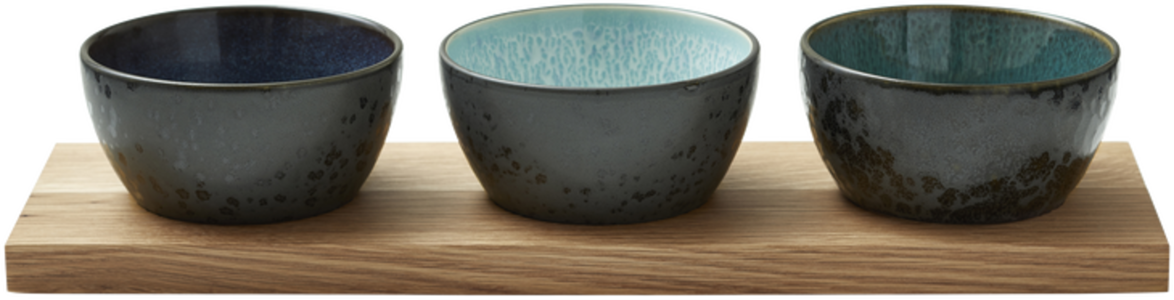 Deze 4-delige set bestaat uit 1 houten dienblad en 3 kommen. De kommen zijn gemaakt van robuust steengoed en zijn prachtig geglazuurd aan de binnenkant. De unieke combinatie van het matte glazuur aan de buitenkant en de drie verschillende kleuren aan de binnenkant geeft de kommen een spannend design. Het dienblad is gemaakt van geolied eikenhout, dat na verloop van tijd iets donkerder zal worden.
