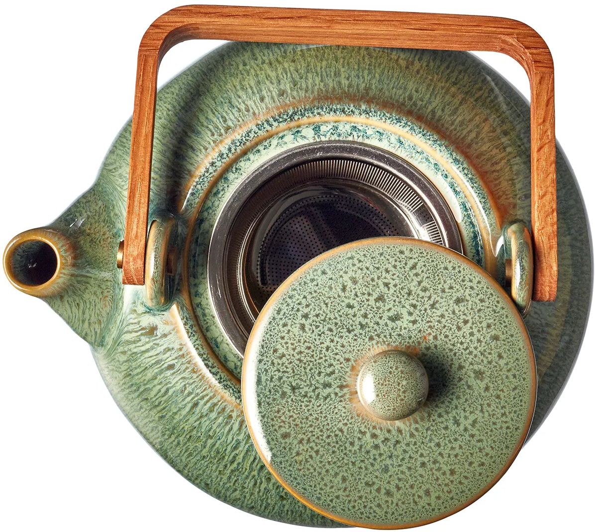 De handgemaakte, bolvormige theepot maakt niet alleen visueel indruk met zijn unieke effectglazuur en geweldige kleuren, maar ook in praktisch opzicht, omdat het geïntegreerde theezeefje eenvoudig kan worden verwijderd.