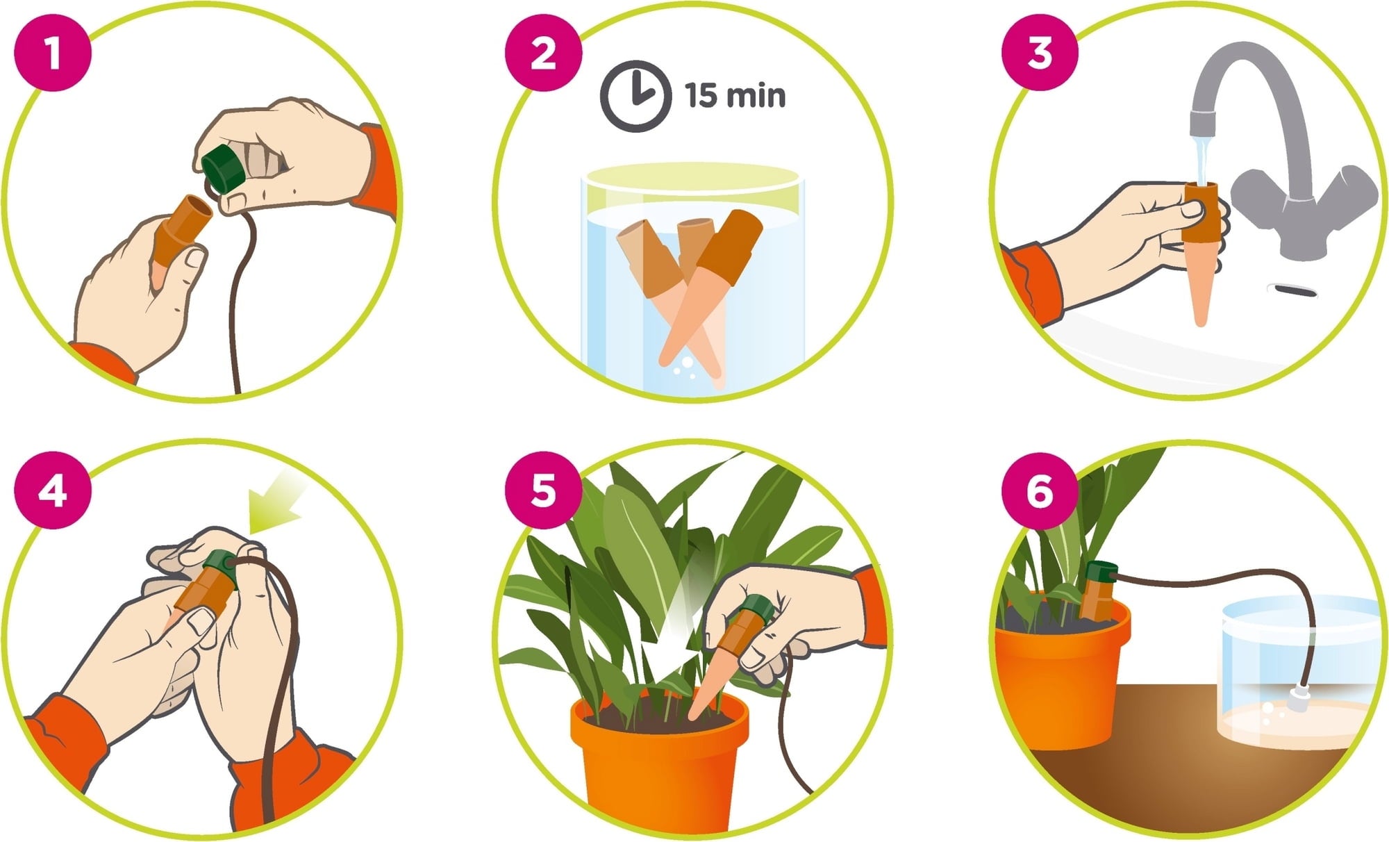Hij wordt eerst gevuld met water en gesloten. De aanzuigslang moet zorgvuldig worden ontlucht. Naarmate de grond droger wordt, laat de kleikegel geleidelijk water los en wordt er binnenin een vacuüm gecreëerd. Hierdoor wordt het water uit de aangrenzende container aangezogen.