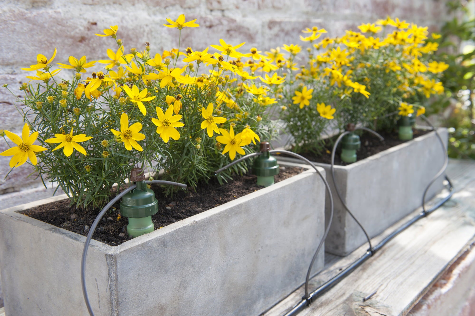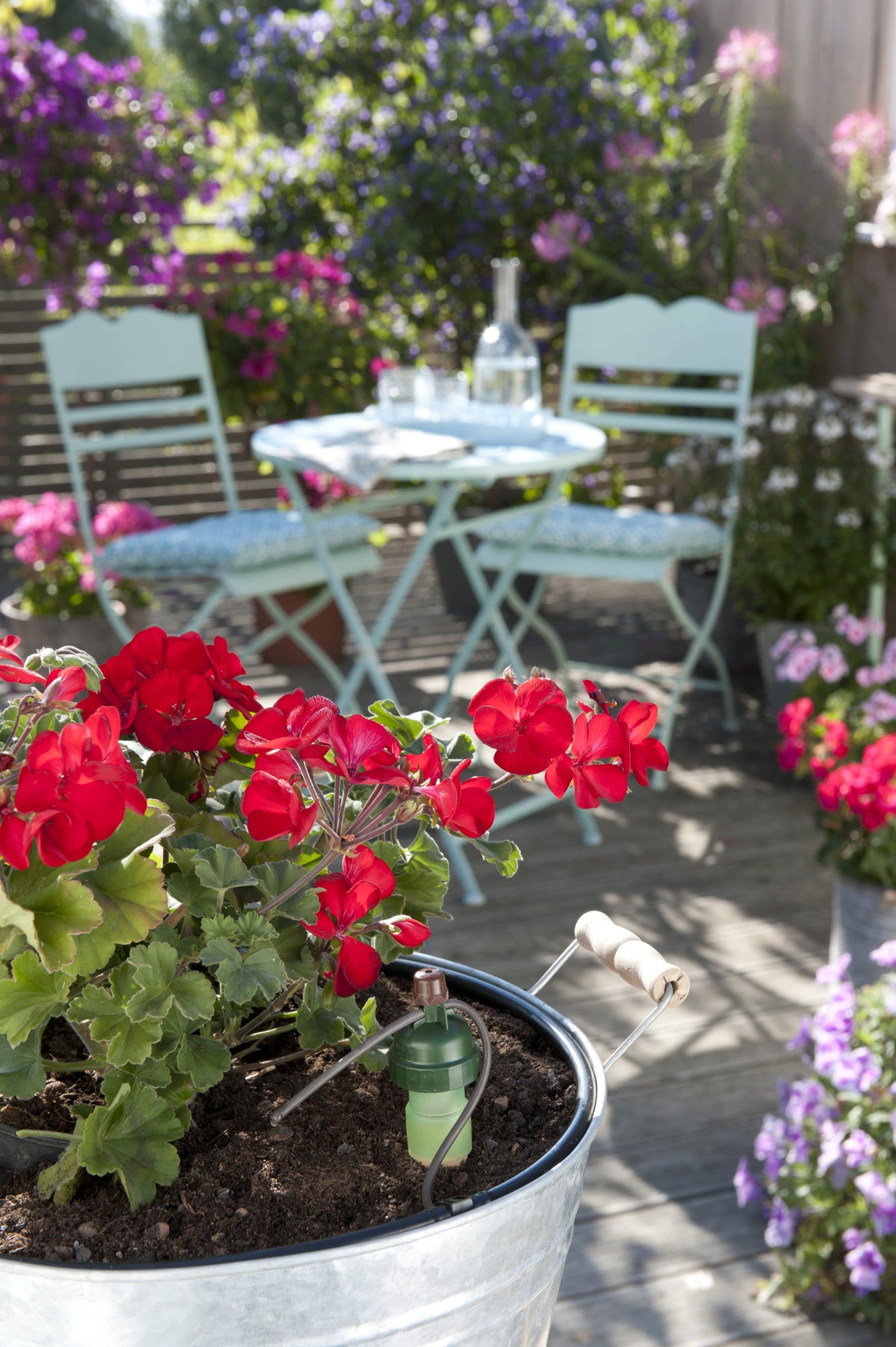 De volgende regel is van toepassing: 4 Druppel-Blumat (4 druppelpunten) per bloembak van 1 m, 3 Druppel-Blumat per bloembak van 0,8 m of 1 Druppel-Blumat voor bloempotten met een diameter tot 25 cm.