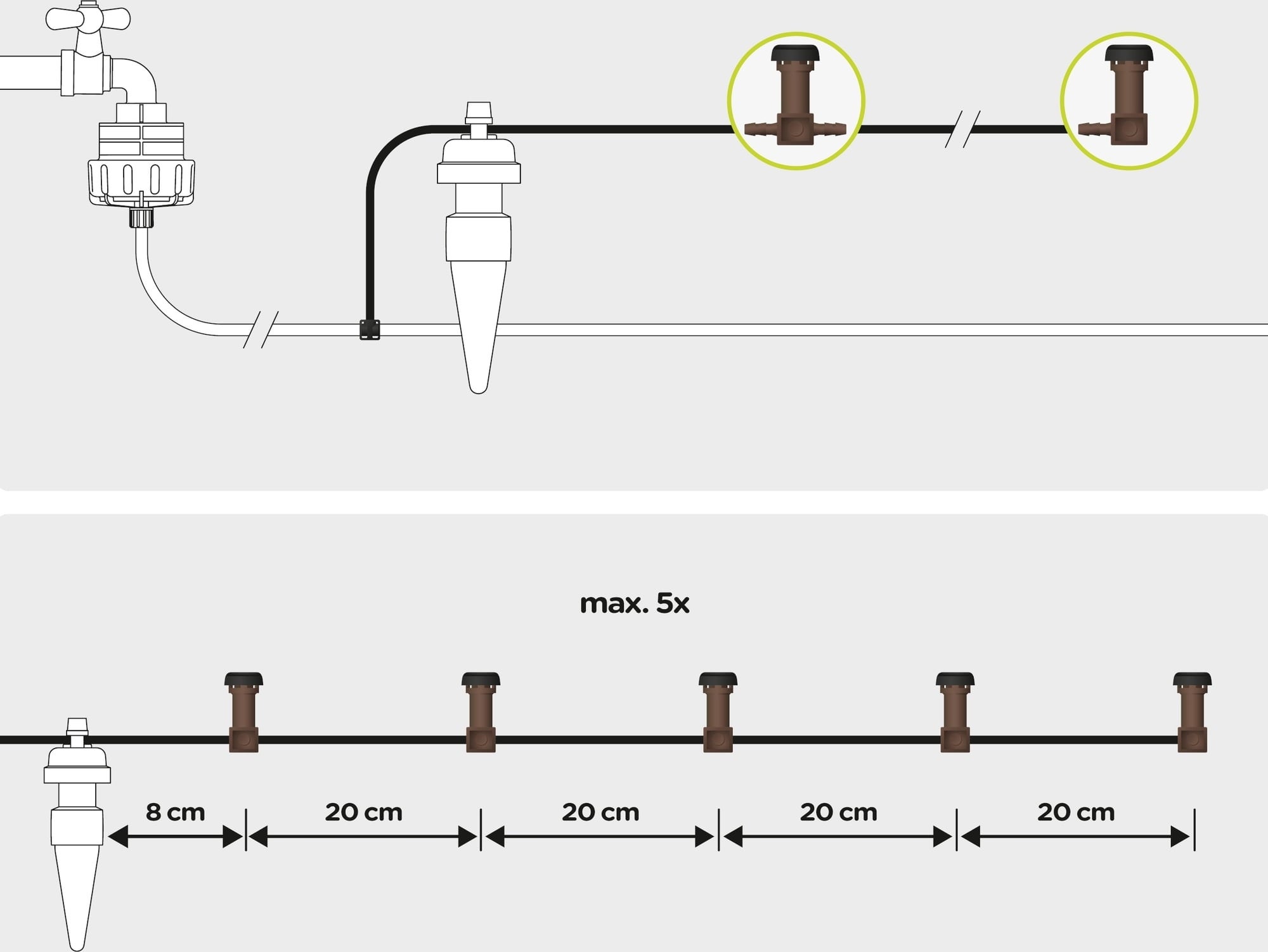 Deze set van 20 druppelsproeiers met een slangpijp aan één kant wordt gebruikt als eindsproeier voor Blumat druppelkettingen.