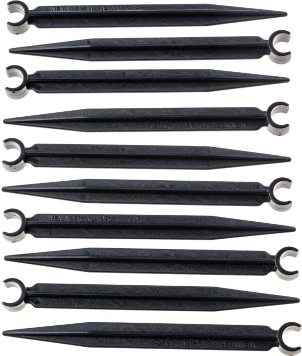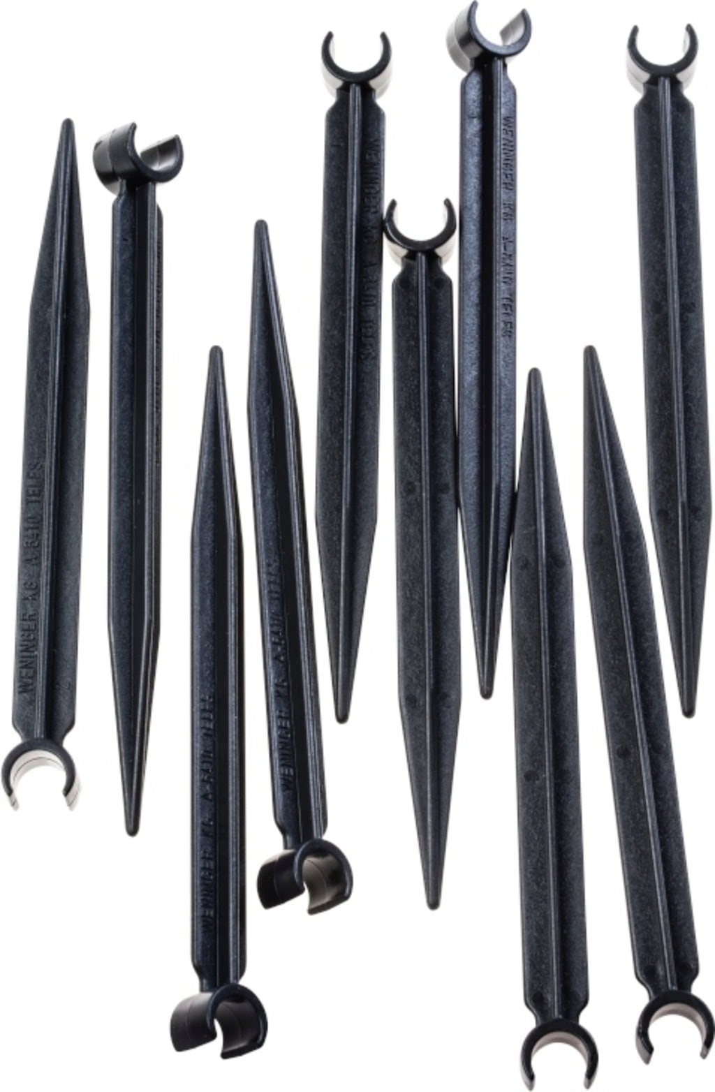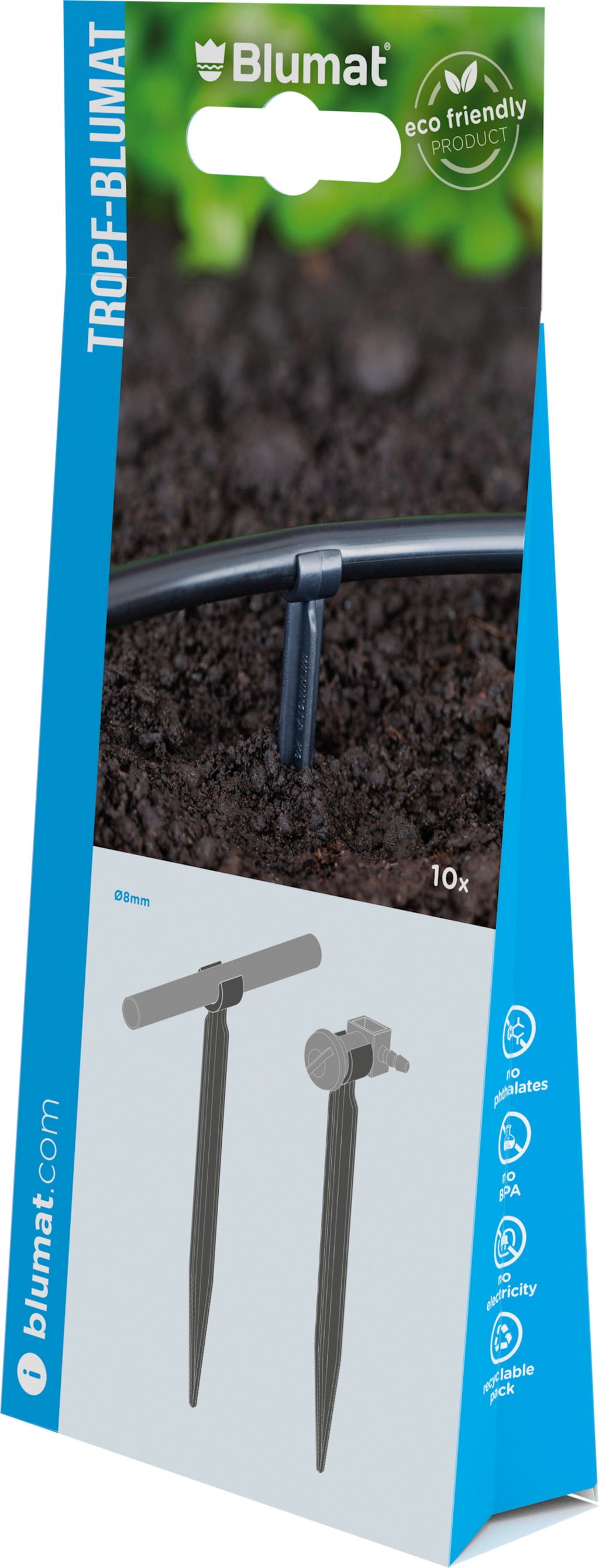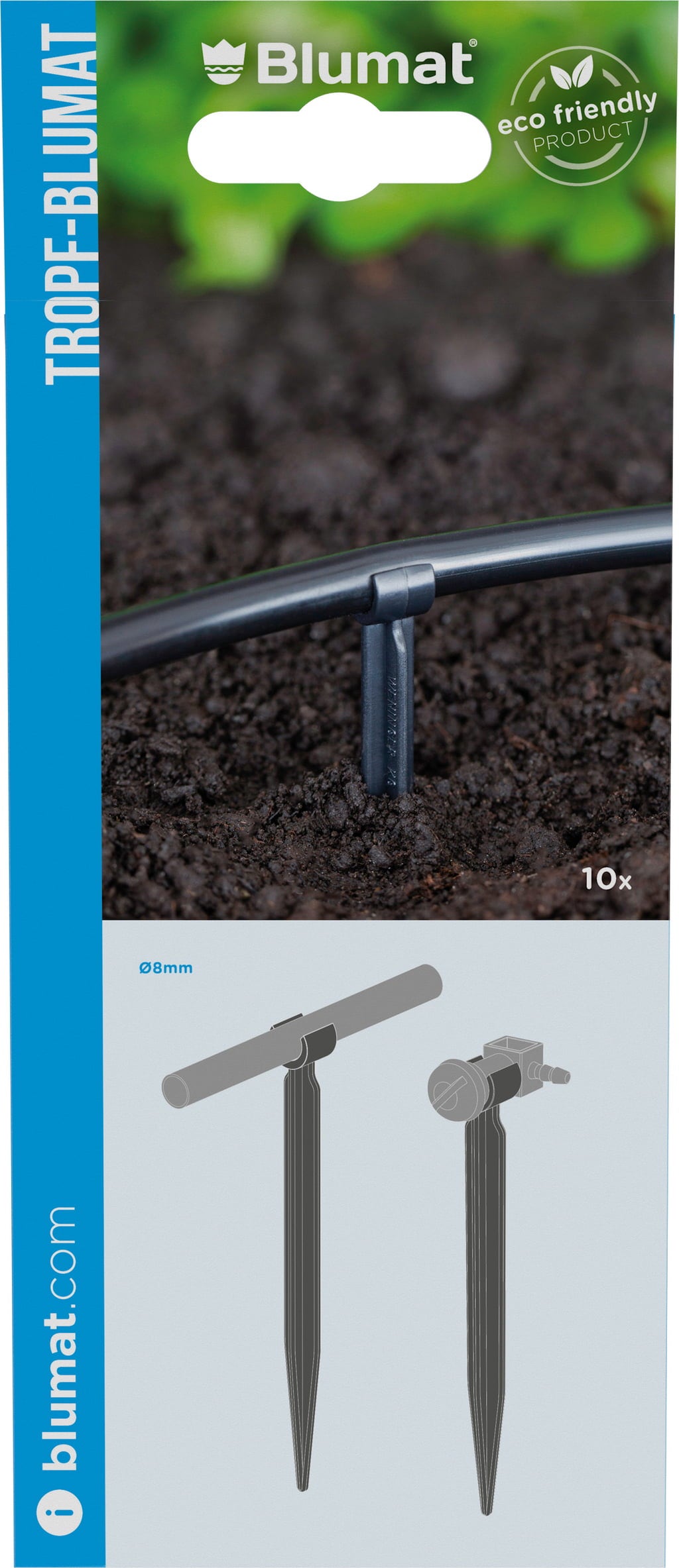 Houder met insteekpen voor het bevestigen van de toevoerslang of als afstandhouder voor een druppelketting of afzonderlijke druppelaars, zodat ze niet rechtstreeks op de grond liggen (voorkomt overmatige vervuiling of verstopping door wortels die in de slang groeien).
