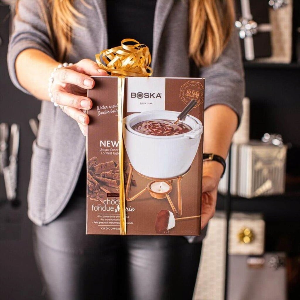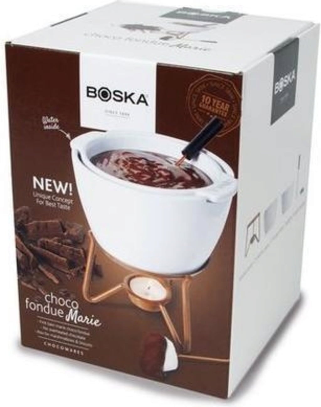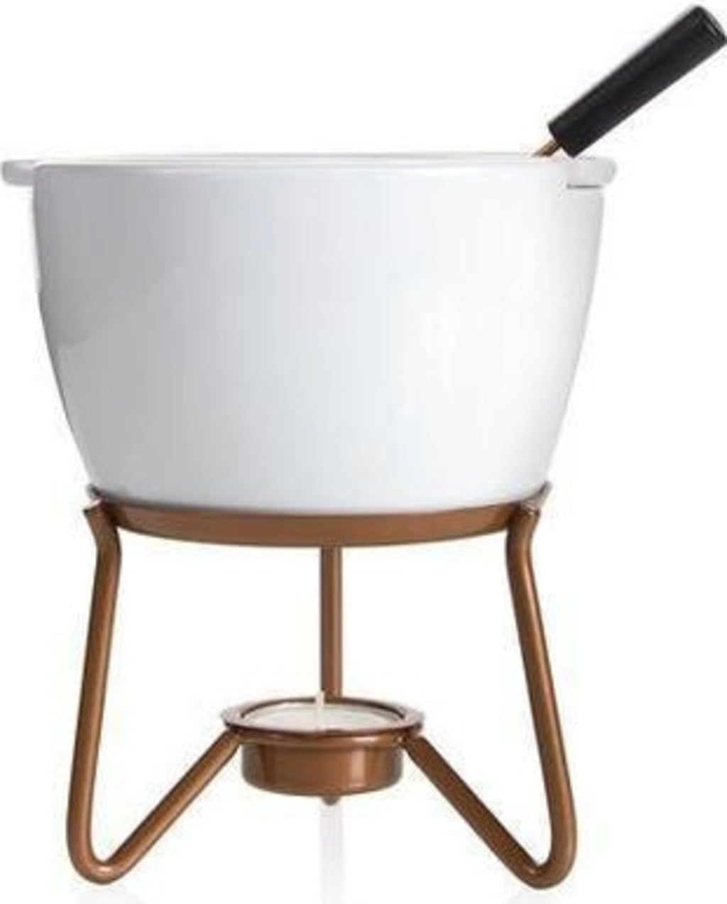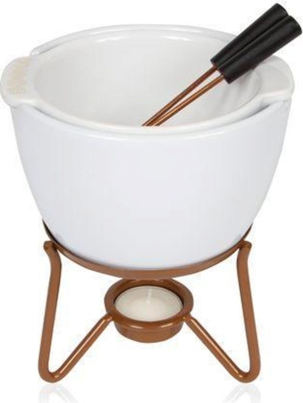 Deze elegante set bestaat uit twee in elkaar passende keramische fonduepannen, een roestvrijstalen frame en twee fonduevorken. De chocolade wordt verwarmd via de waterbadmethode en heeft daardoor constant de optimale temperatuur van 40° C en blijft permanent vloeibaar. Het water tussen de twee potten zorgt er bovendien voor dat de warmte van het theelichtje optimaal wordt verdeeld en voorkomt dat deze aanbrandt. Urenlang heerlijk plezier voor iedere zoetekauw is gegarandeerd.