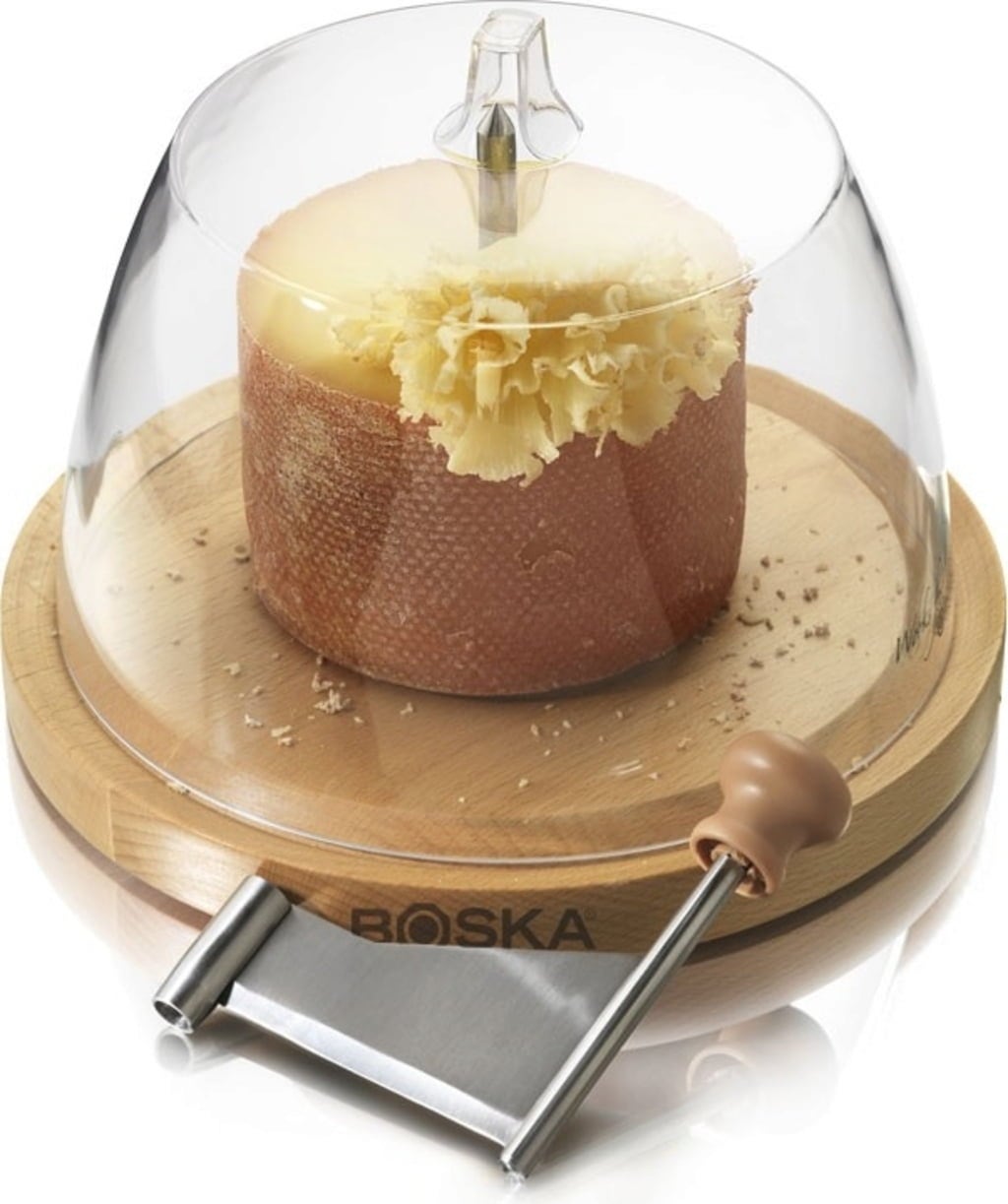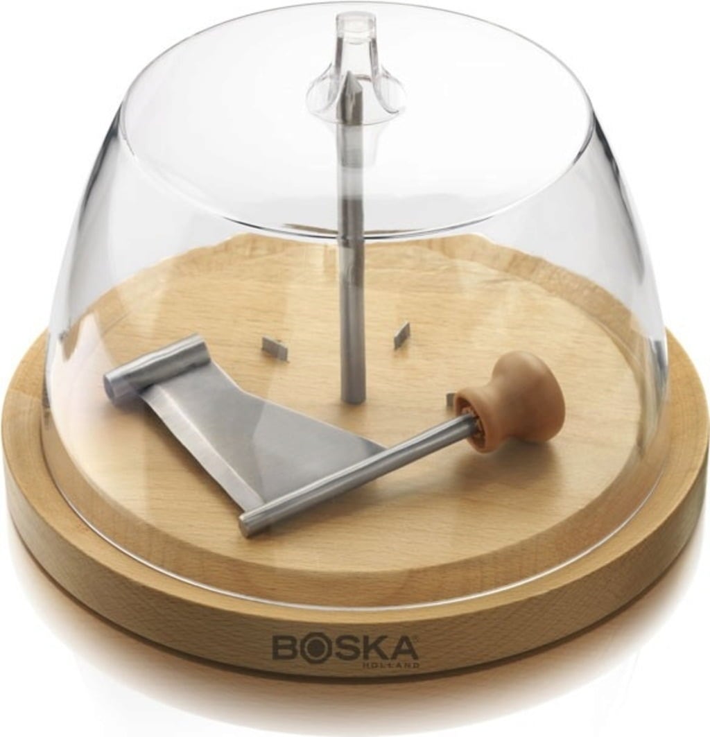 Deze kaasschaaf wordt gebruikt om flinterdunne plakjes kaas te snijden. Plaats het blok kaas eenvoudig op een metalen pin en schuif het mes over de bovenkant van het blok. Geniet van verse kaas direct van de kaasplank. De meegeleverde glazen stolp houdt de kaas vers en houdt de geur van de kaas binnen!