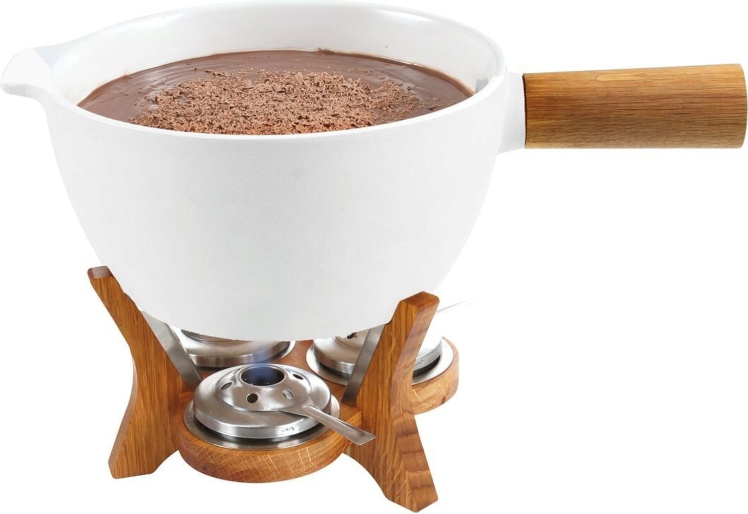 Deze extra grote fondueset is ideaal voor maximaal 12 personen. Naast zijn ontwerp, dat de Red Dot Design Award heeft gewonnen, overtuigt hij door zijn uitstekende materiaalkwaliteit en perfecte gebruikseigenschappen. De vuurvaste aardwerk pan biedt plaats aan ca. 6 liter kaas, terwijl drie roestvrijstalen branders zorgen voor een perfecte warmteverdeling. Het robuuste eikenhouten frame garandeert te allen tijde stabiliteit.