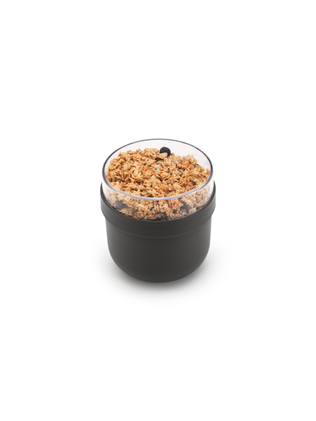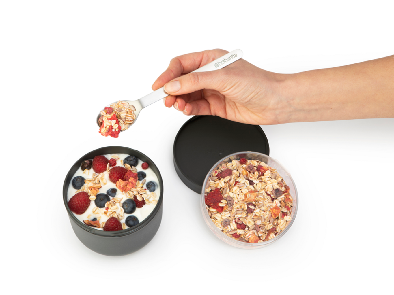 In de trein, op kantoor of in de collegezaal - met deze slimme ontbijtbox kun je overal vers en lekker van je muesli, pap of yoghurt genieten. De aparte schroefdophouder houdt het beleg droog, de lekvrije verzegeling beschermt je zak - en alles is magnetron- en vriezerbestendig. Ontbijten kan niet slimmer!