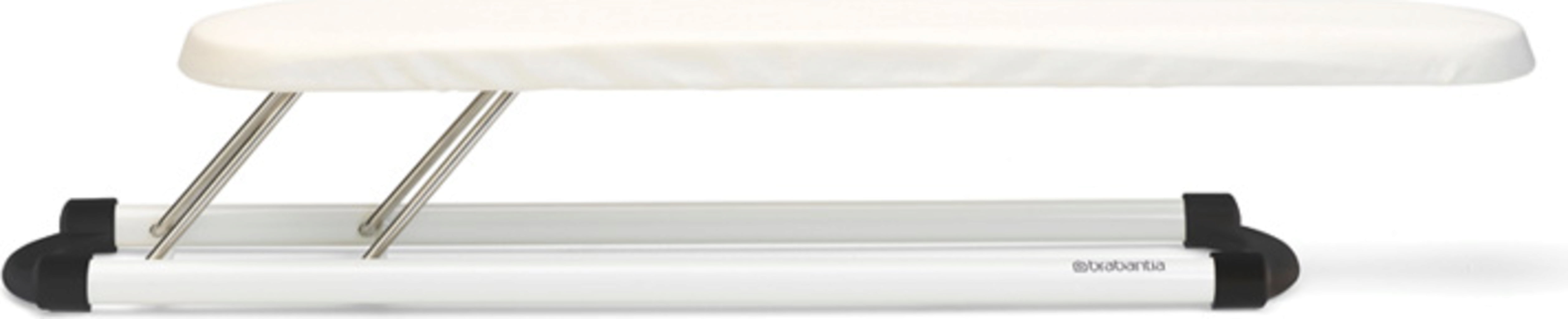 De kleine speciale plank is ideaal voor huishoudens met veel blouses en overhemden. Dit komt omdat mouwen en halslijnen veel effectiever gestreken kunnen worden met deze vorm. De anti-slip beschermkappen zorgen voor stabiliteit en het dampdoorlatende metalen oppervlak met elastische schuimvulling is geschikt voor alle standaard- en stoomstrijkijzers. Nog meer comfort wordt geboden door het stabiele, precies passende oppervlak, dat perfect strijken mogelijk maakt. De opvouwbare mini-strijkplank is gemakkelijk op te bergen en op te hangen met de ophanglus.