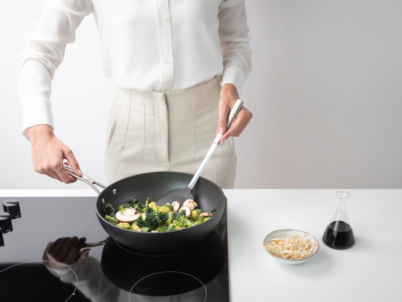 De hoogwaardige wokspatel in elegant roestvrijstalen design ziet er niet alleen goed uit, maar is ook veelzijdig en uiterst praktisch. Het draaioppervlak van hittebestendig siliconen is bijzonder elastisch, terwijl de afgeronde vorm zorgt dat je gemakkelijk kunt roeren en draaien in de wok en pan. Dit voorkomt ook krassen en beschadigingen aan antiaanbakpannen.