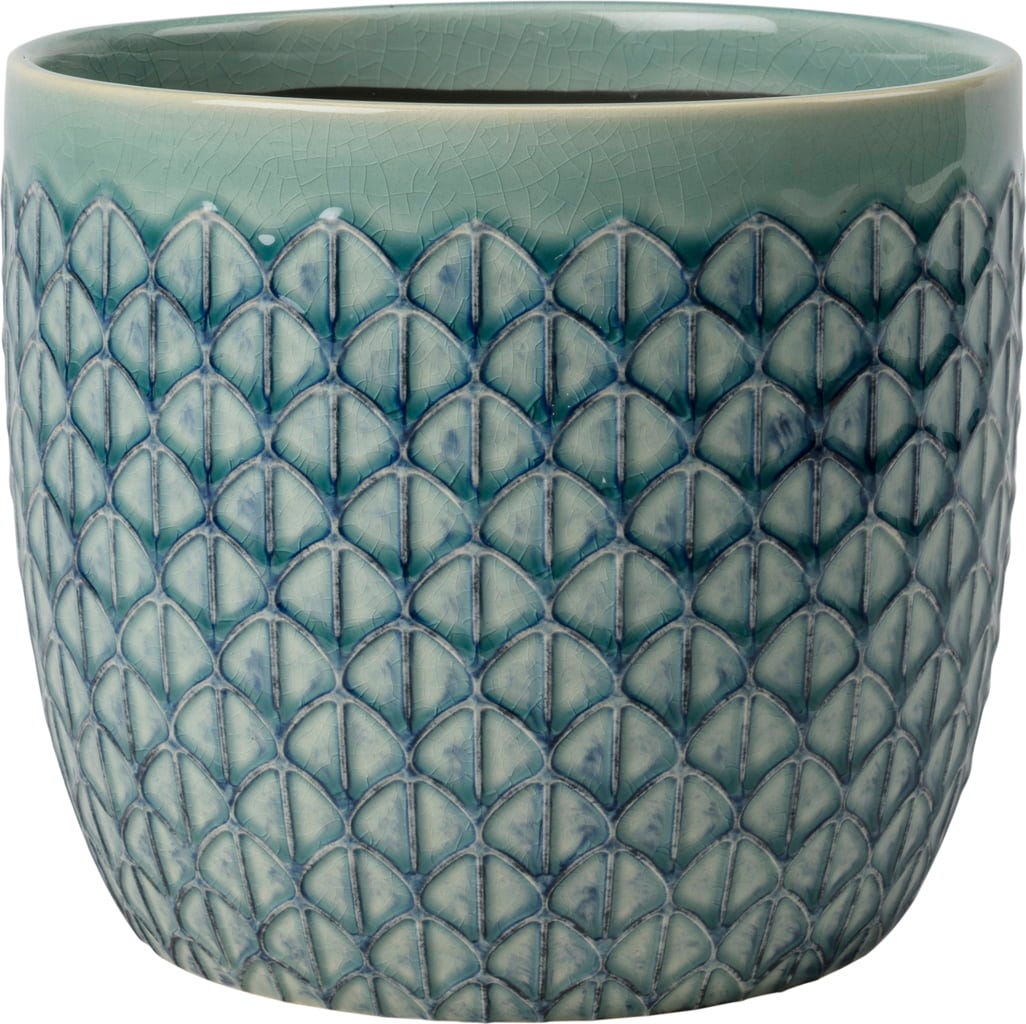 Geef je huis een elegant en modern tintje met deze kunstzinnig ontworpen pot voor kamerplanten. Het verhoogde patroon wordt stijlvol geaccentueerd door een diepblauwe kleurschakering. Een subtiel craqueléglazuur in prachtig celadon groen/blauw voegt diepte toe aan het ontwerp en maakt van deze pot een echte blikvanger.