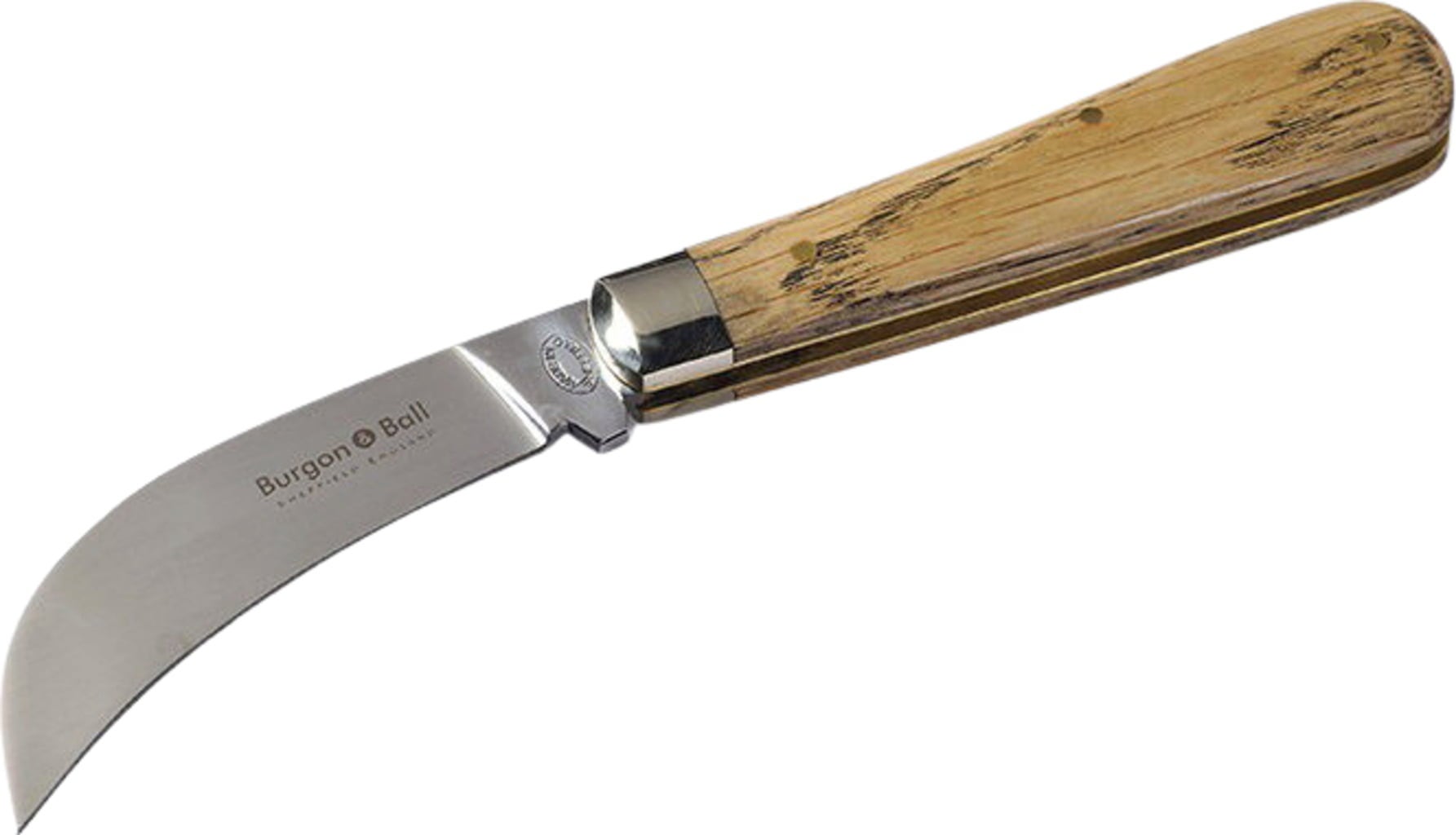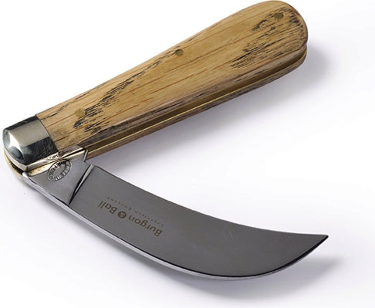 Traditioneel gevormd mes met een uitgesproken haak om elke snede perfect af te ronden. Het grove handvat is ideaal voor grotere (heren)handen. Het lemmet is gemaakt van hoogwaardig koolstofstaal, het handvat is gemaakt van FSC®-gecertificeerd eikenhout en de lemmetbehuizing is gemaakt van massief messing.