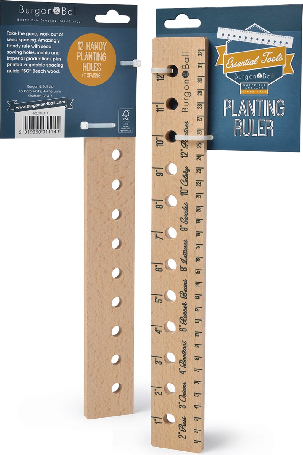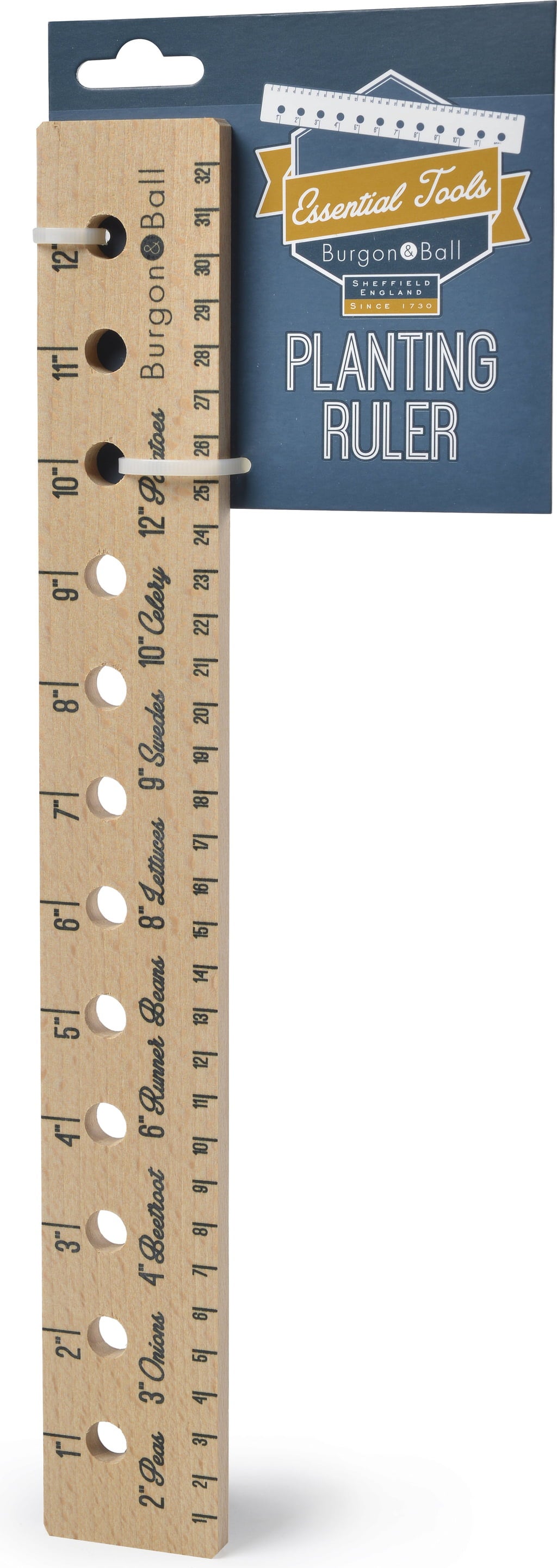 Erg handige plantlineaal met zaaigaten, metrische en Engelse schaalverdeling en bedrukte zaaigids. Gemaakt van FSC®-gecertificeerd beukenhout