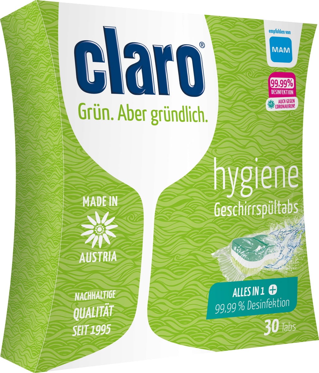 De Hygiëne Tabs van claro zijn bijzonder geschikt voor mensen met allergieën, omdat ze 99,99% van alle bacteriën, virussen en schimmels verwijderen. Zelfs babyschalen en flessen worden grondig ontdaan van resten en hygiënisch gereinigd. Natuurlijk kunnen de tabs ook worden gebruikt voor de gewone vaat. Omdat er al zout- eng lansspoelmiddelvervangers in zitten, hoef je geen extra producten te gebruiken. De tabs ontwikkelen hun volledige effectiviteit zelfs bij lage temperaturen en maken indruk met hun anti-kalkfunctie.