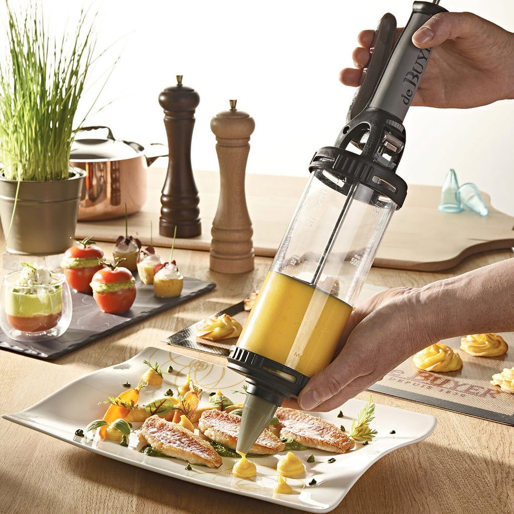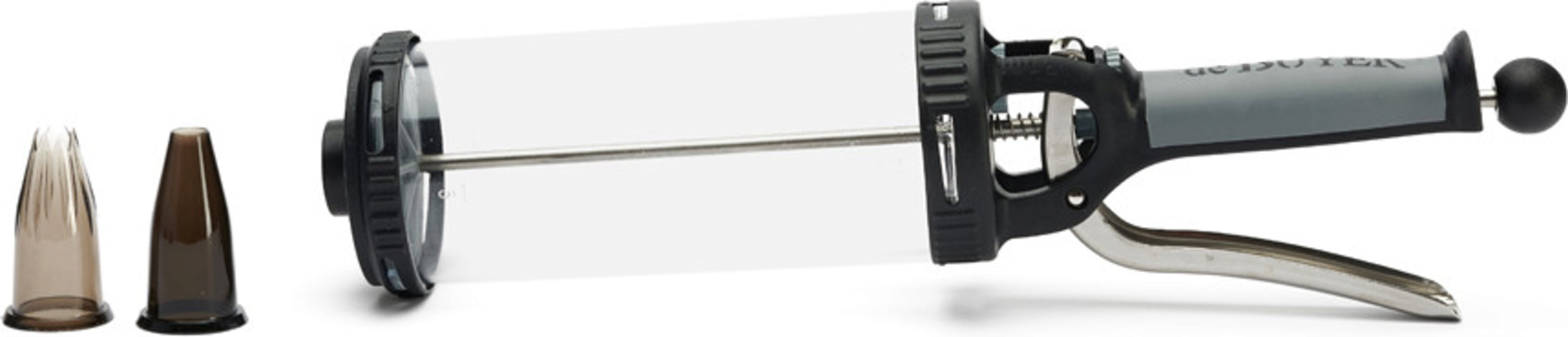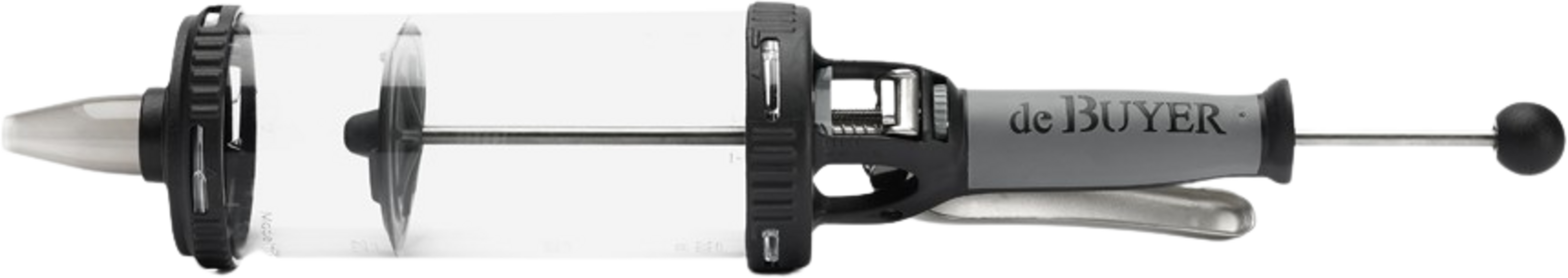 Le Tube is een cilindrische spuit die dezelfde functies vervult als een spuitzak. Hij is heel gemakkelijk te vullen en heeft niet alleen een schaalverdeling, maar ook een stelwieltje met schaalverdeling in cl en oz, zodat je de te doseren hoeveelheid perfect kunt afstellen, de stroom wordt gestopt tijdens twee doseringen - ideaal om de perfecte dosering te vinden.