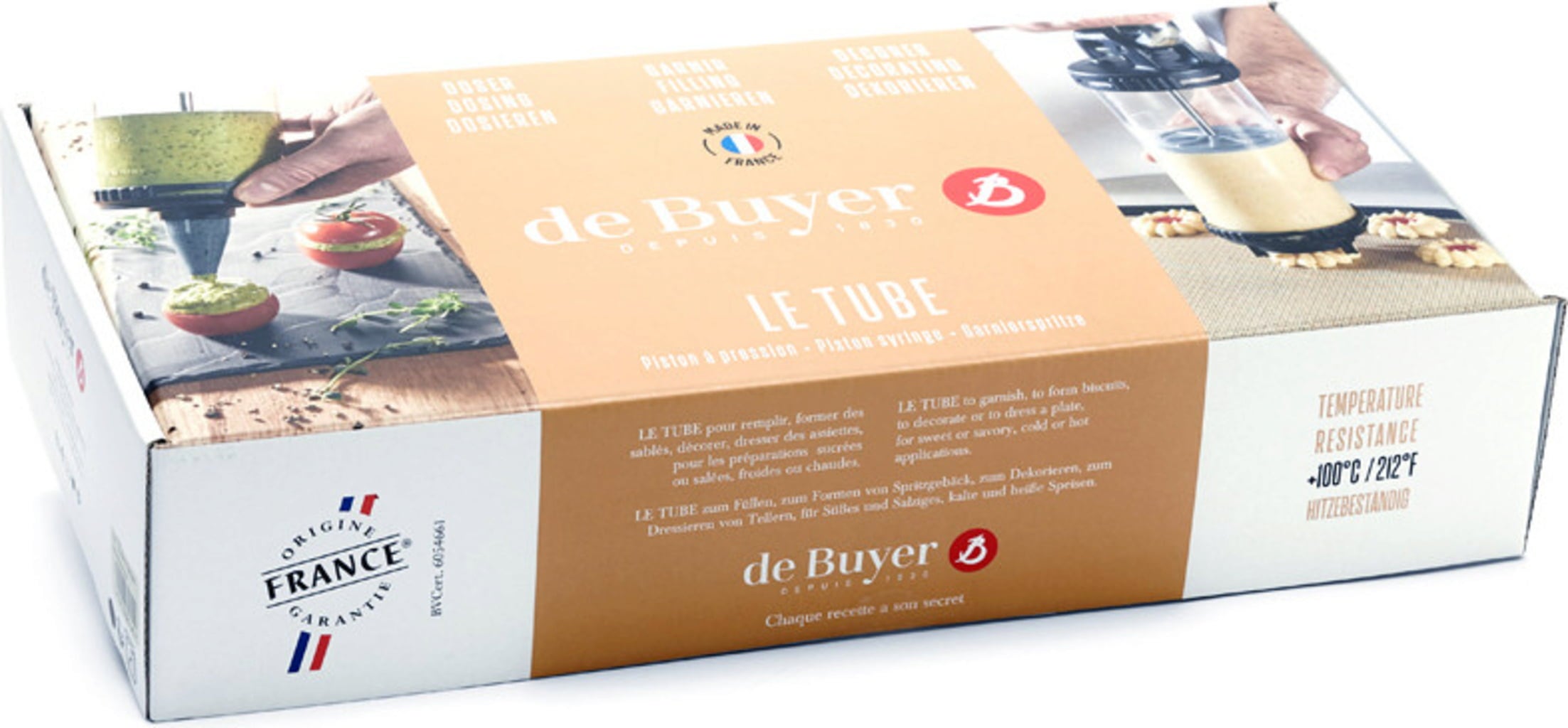 Le Tube is een cilindrische spuit die dezelfde functies vervult als een spuitzak! Hij is heel gemakkelijk te vullen en heeft niet alleen een schaalverdeling, maar ook een stelwieltje met schaalverdeling in cl en oz, zodat je de te doseren hoeveelheid perfect kunt afstellen, de stroom wordt gestopt tijdens twee doseringen - ideaal om de perfecte dosering te vinden!