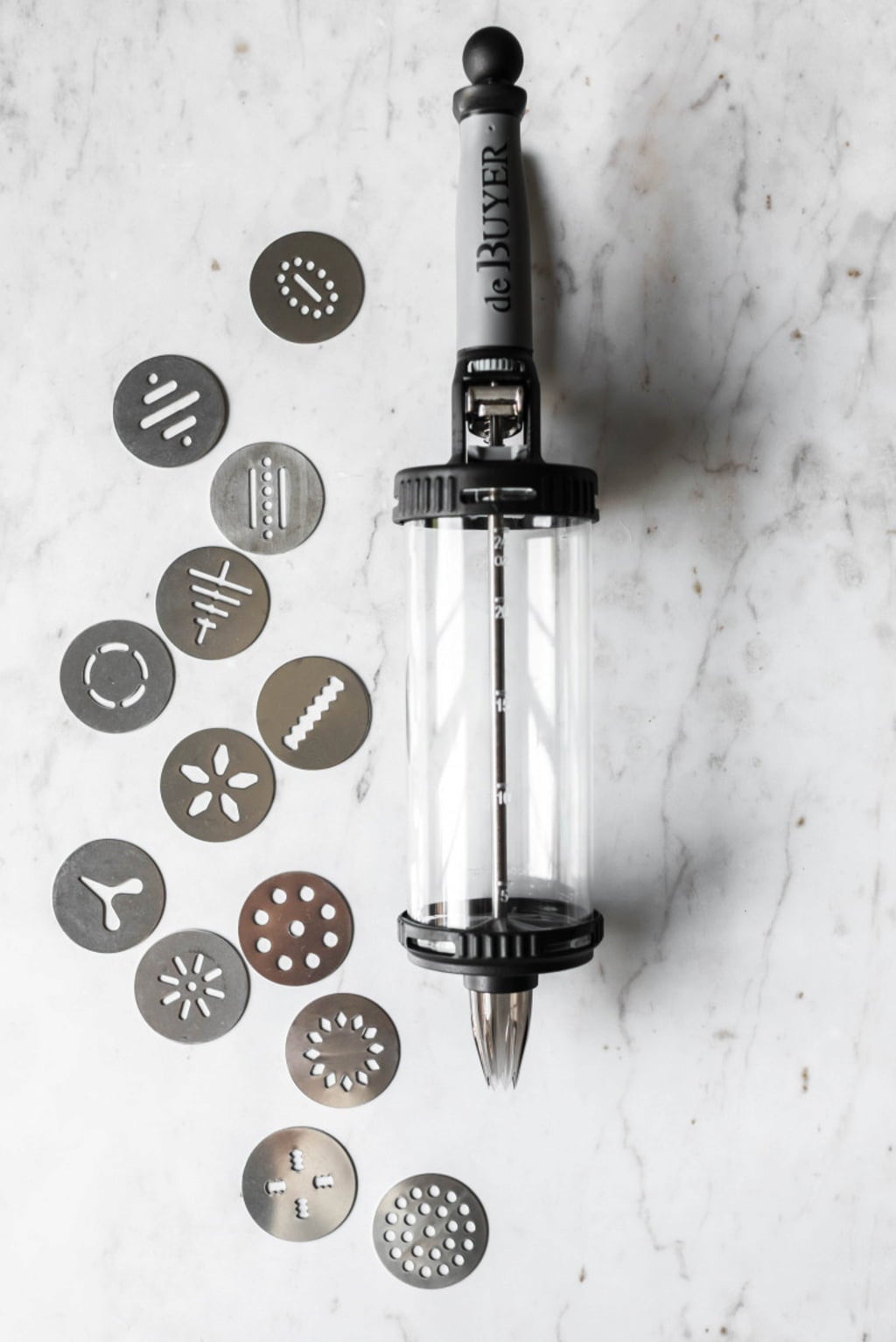 Je kunt dus gemakkelijk vullen, decoreren en garneren, zelfs dikke crèmes, soezendeeg en mousses zijn geen uitdaging voor Le Tube. Deze set bevat ook een speciale montageset bestaande uit 13 verwisselbare roestvrijstalen schijven waarmee je een grote verscheidenheid aan koekjes kunt vormen.