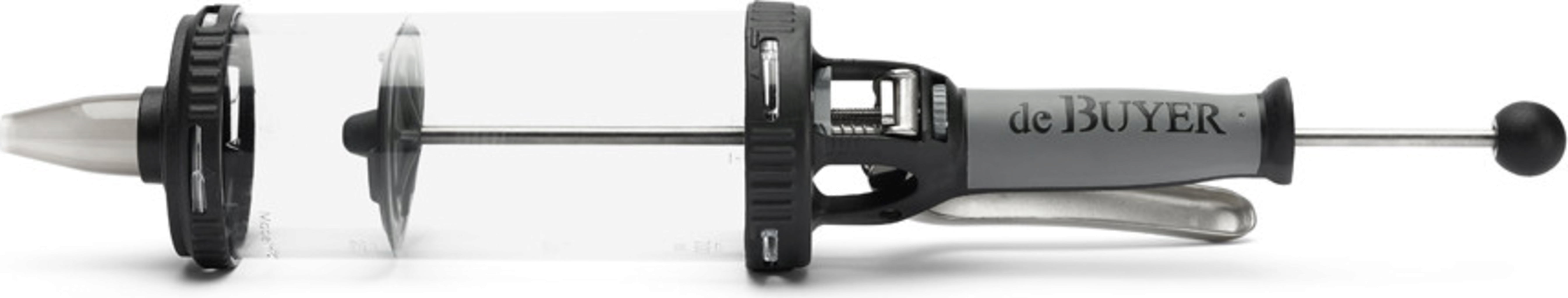 Le Tube is een cilindrische spuit die dezelfde functies vervult als een spuitzak. Hij is heel gemakkelijk te vullen en heeft niet alleen een schaalverdeling, maar ook een stelwieltje met schaalverdeling in cl en oz, zodat je de te doseren hoeveelheid perfect kunt afstellen, de stroom wordt gestopt tijdens twee doseringen - ideaal om de perfecte dosering te vinden.