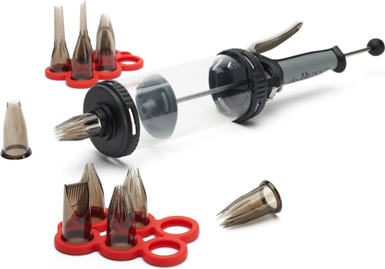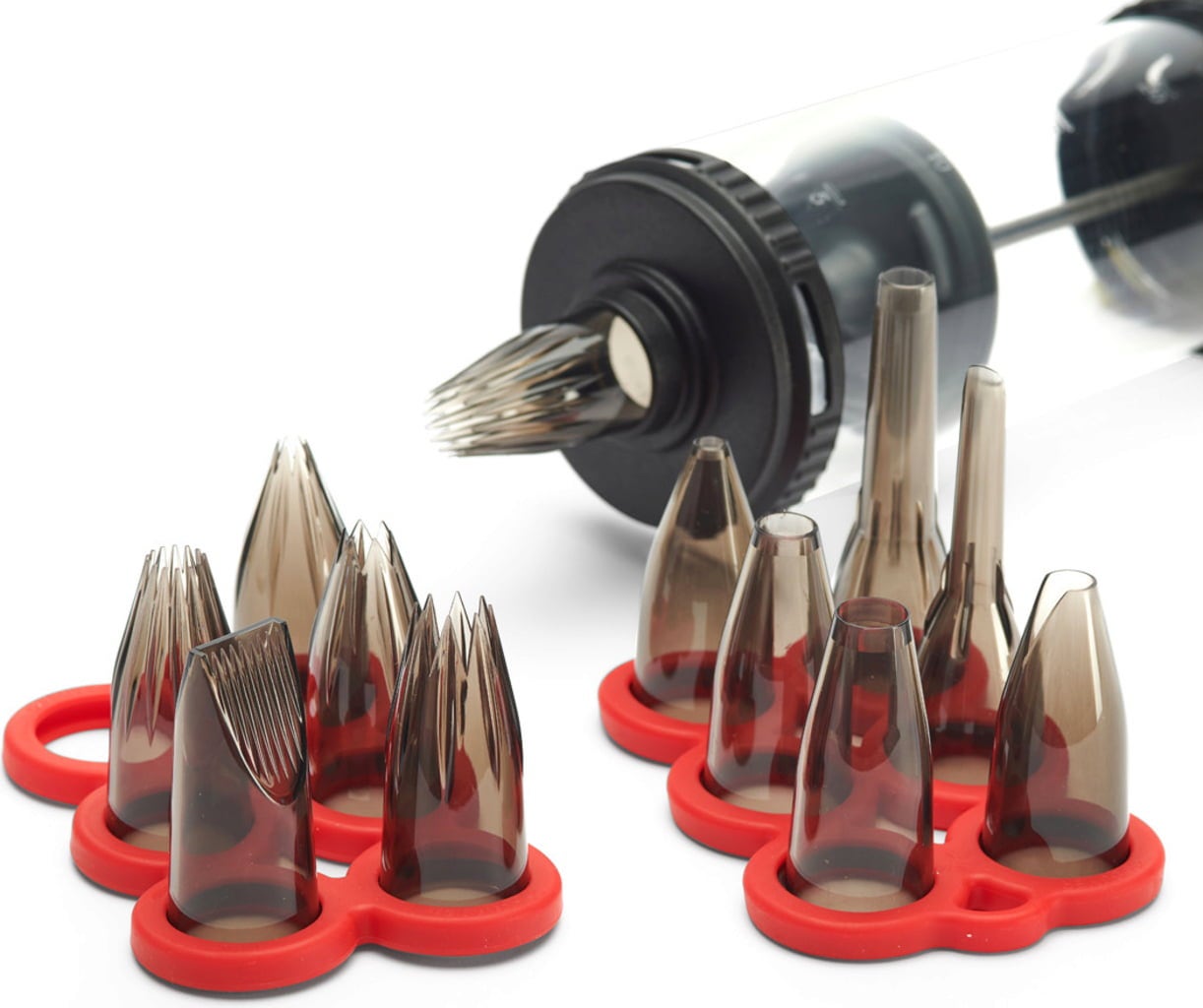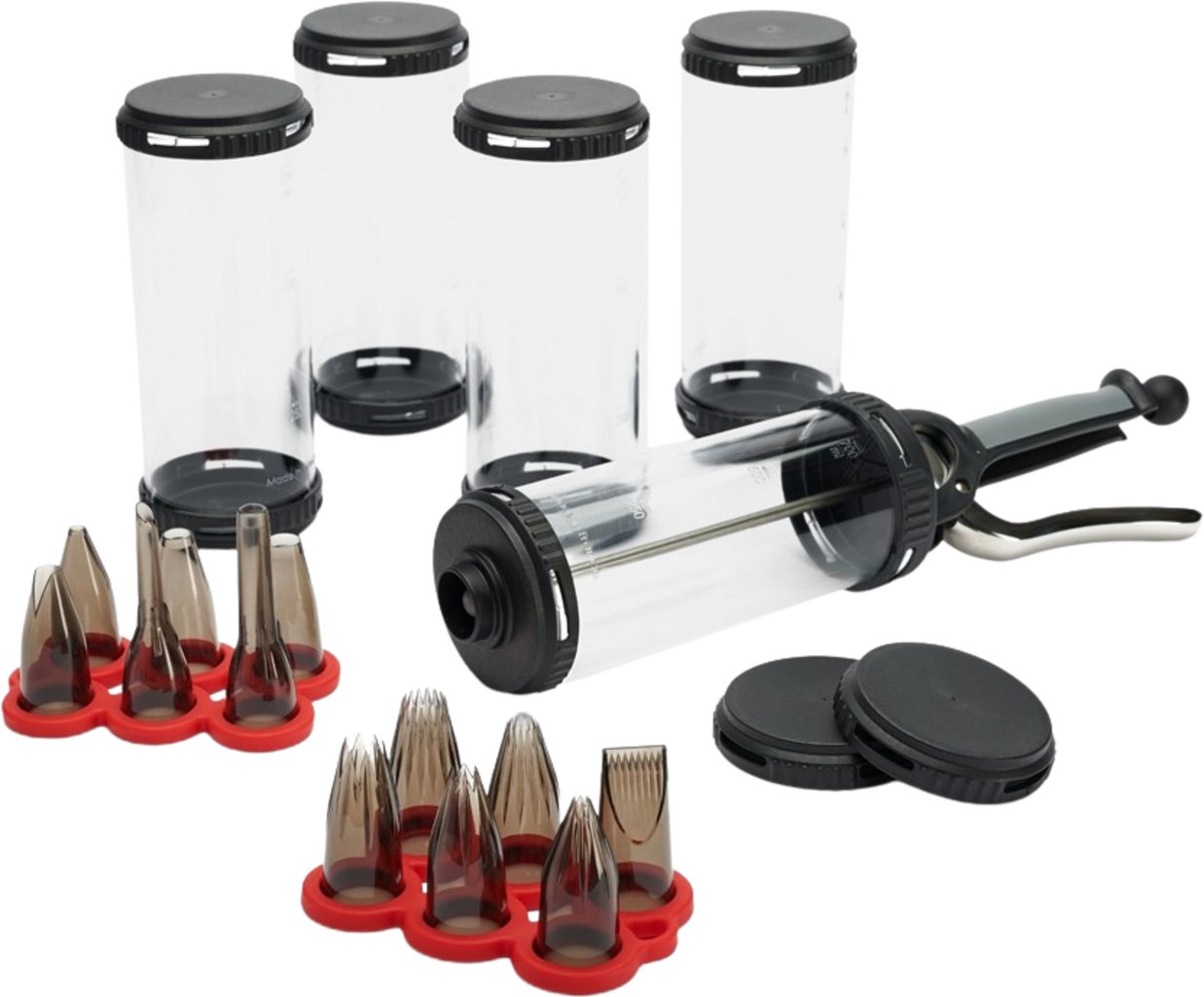 Zo kun je gemakkelijk vullen, decoreren en garneren, zelfs dikke crèmes, soezendeeg en mousses zijn geen uitdaging voor Le Tube. Deze set bevat ook vier bakjes en 12 verschillende spuitmondjes.