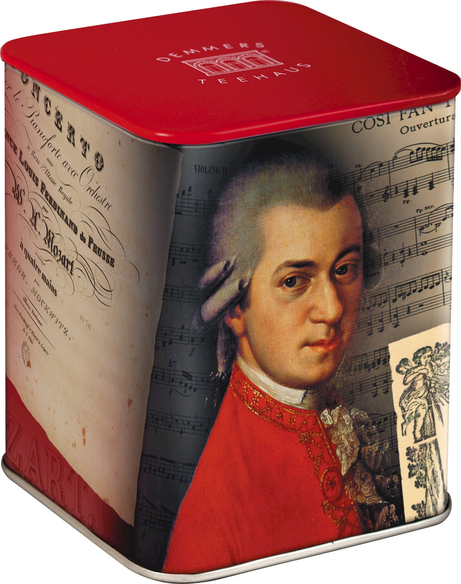 Het portret van Mozart siert deze prachtige metalen theeblik - en is een perfect geschenk voor liefhebbers van klassieke muziek. Het is gevuld met 100 g zwarte thee uit Ceylon (Sri Lanka) en China, vakkundig gemengd en verfijnd met aromatische sinaasappelolie. De infusie heeft een sterke smaak met fruitige kruidigheid en zachte zoetheid in de mond. Ideaal voor de middag of bij het ontbijt!