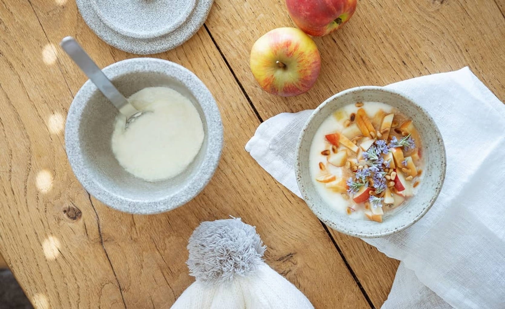 Of het nu gewone koemelk, lactosevrije melk, magere melk of sojamelk is, met de DENK yoghurtmaker kun je yoghurt maken volgens je persoonlijke voorkeur. Verwarm de melk van je keuze kort tot 80°C en giet het dan in de yoghurtmaker, waarop je het deksel en de thermometer plaatst. Na ongeveer een uur, wanneer de melk is afgekoeld tot 45-42°C, voeg je drie eetlepels yoghurt toe. Doe het deksel er weer op en doe de gebreide hitteafdekking eroverheen. Het zal nu ongeveer acht uur duren voordat je van je zelfgemaakte yoghurt kunt genieten.