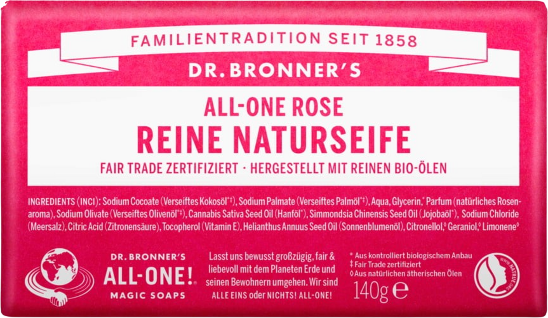 Sodium Cocoate (Verseiftes Kokosöl)[1], Sodium Palmate (Palm Soap)[1], Aqua, Sodium Olivate[1], Glycerin (Aus Pflanzenölverseifung), Sodium Hempate[1], Sodium Jojobate[2], Natural Rose Fragrance, Sodium Chloride, Citric Acid, Tocopherol (Vitamin E), Citral[3], Citronellal[3], Geraniol[3], D-Limonen[3], Linalool[3]
