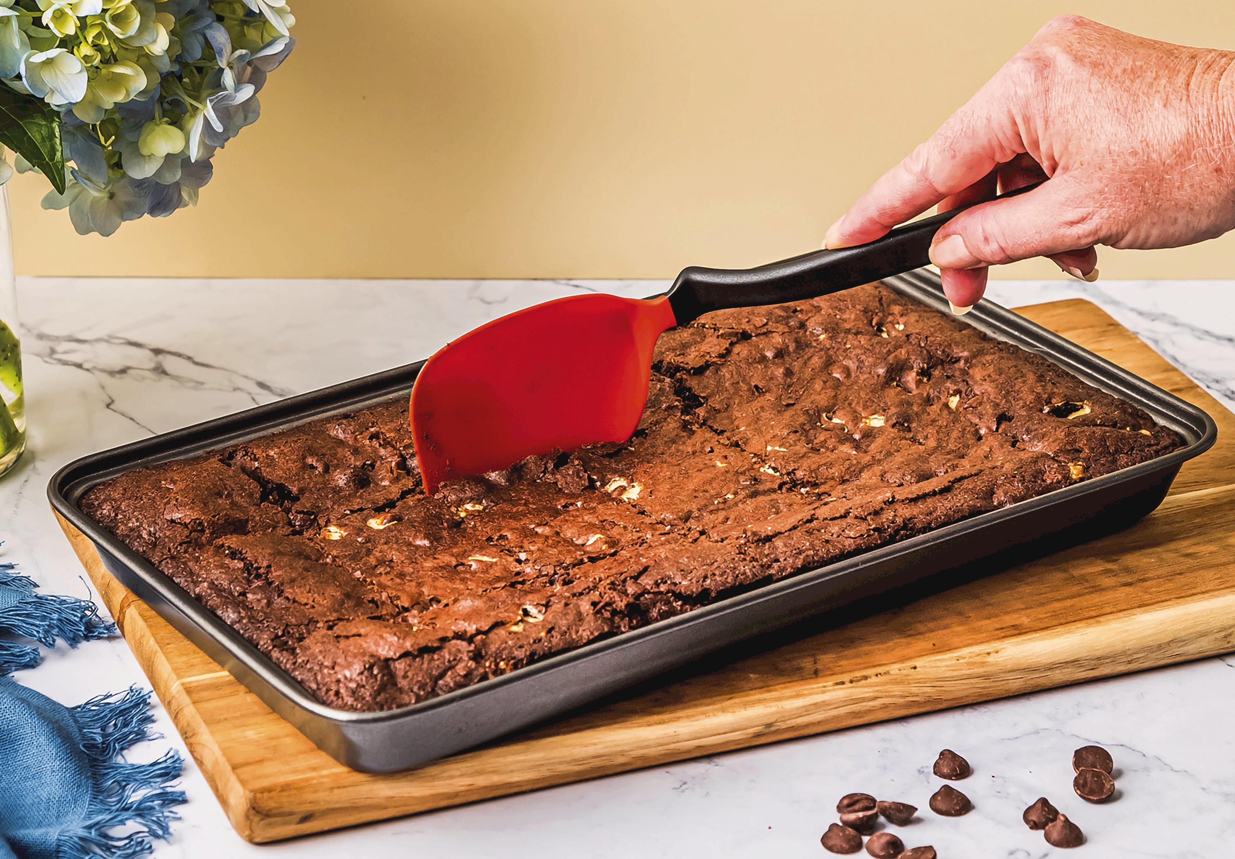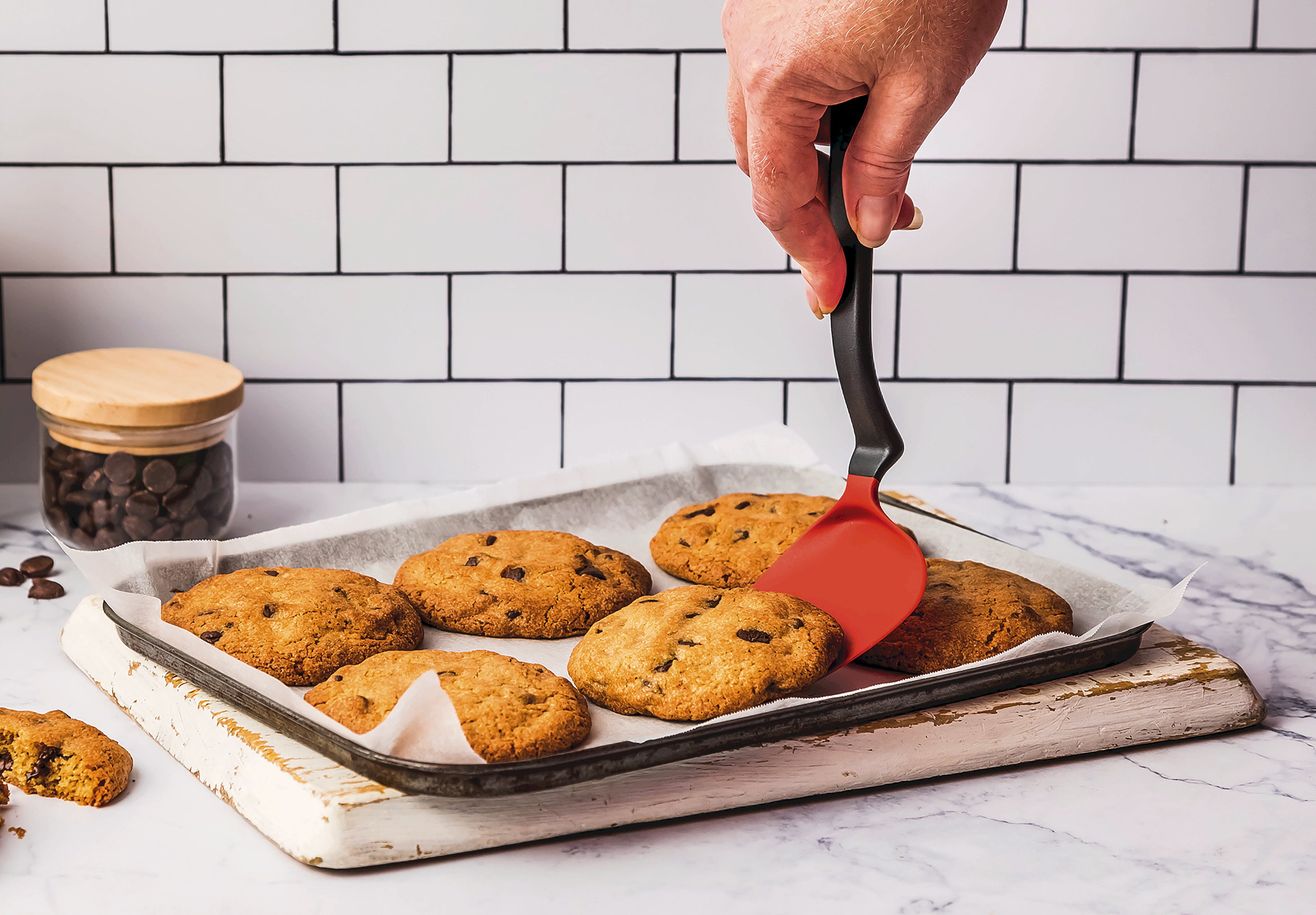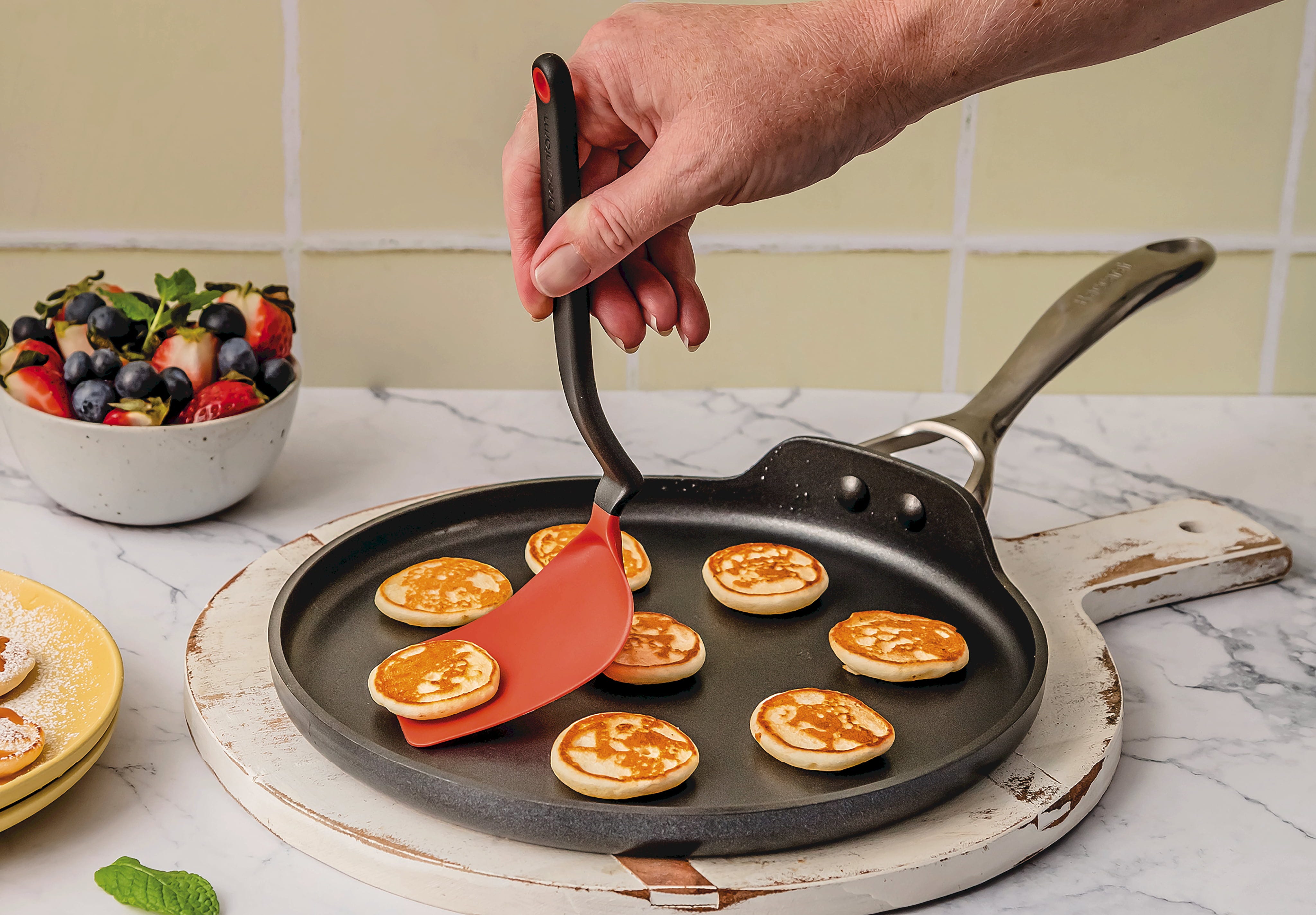 De Mini Chopula van Dreamfarm is de perfecte hulp voor delicate taken zoals het omdraaien van koekjes, eieren of brownies. Dankzij de afgeschuinde greep en de meervoudig gebogen kop bereik je moeiteloos elke hoek in pannen of op bakplaten. Het innovatieve "Sit-Up"-ontwerp houdt de kop van het werkblad af, zodat deze altijd schoon blijft.
