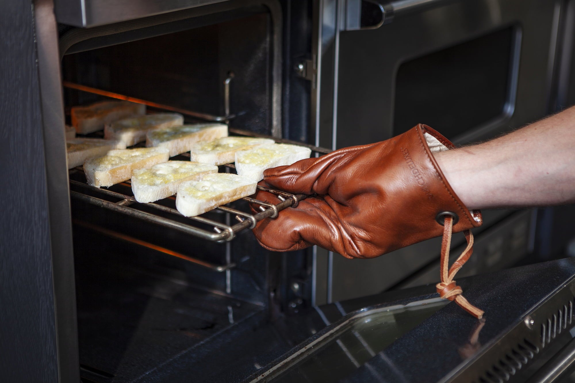Handgemaakte ovenhandschoenen van 100% leer met hittebestendige voering.