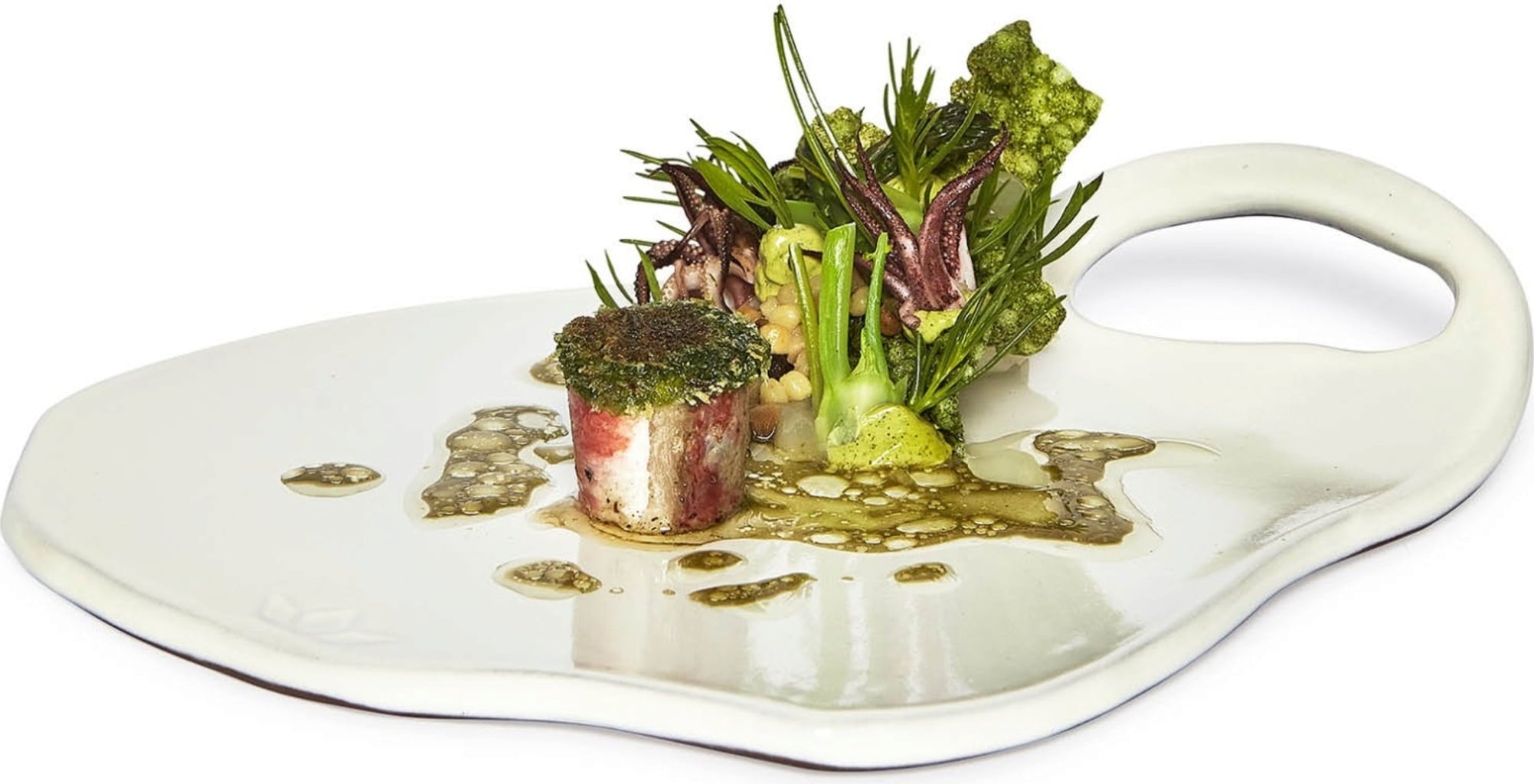 Deze ongewone serveerplank van fijn keramiek is het perfecte accessoire om je gasten exclusieve lekkernijen aan te bieden. Het maakt indruk met zijn spannende vorm en elegante oppervlak, waardoor het een onweerstaanbare blikvanger is op elke tafel.