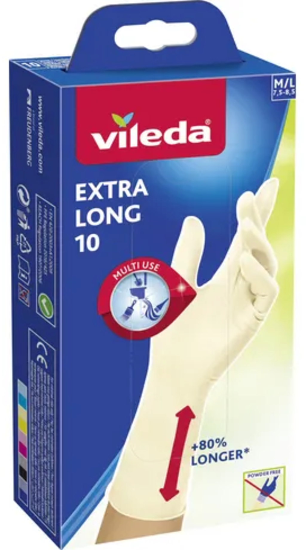 Deze wegwerphandschoenen van vileda zijn bijzonder lang en extra scheurvast dankzij slijtvast latex. De handschoenen kunnen zowel aan de linker- als aan de rechterhand gedragen worden. Door hun lengte zijn ze ideaal voor onhygiënisch schoonmaakwerk.