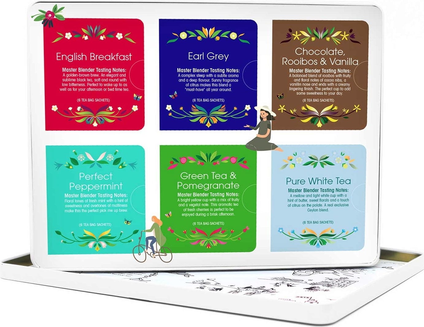 Elke smaak wordt vertegenwoordigd door 6 zakjes - dus je kunt naar hartenlust proberen, delen, ruilen en vergelijken! De liefdevol ontworpen geschenkdoos is gemaakt van reliëfmetaal, houdt elke theekeuken netjes en kan steeds opnieuw worden gevuld. In totaal zijn 36 theezakjes inbegrepen.