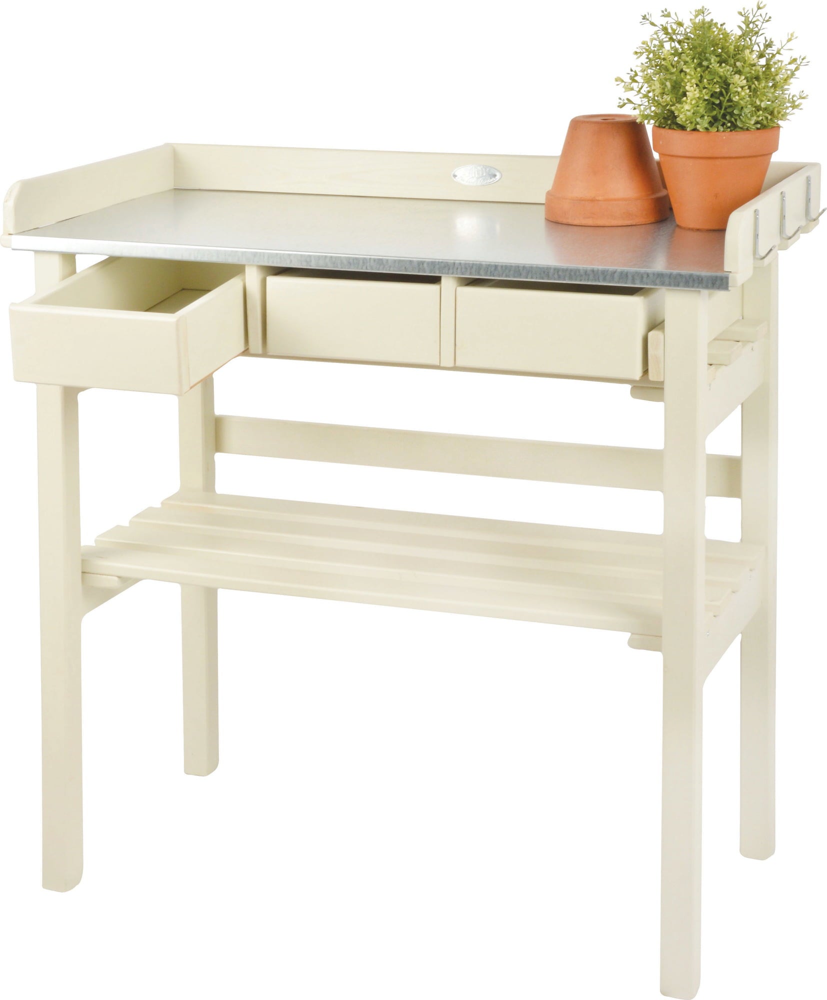 Met zijn zinken werkblad, drie laden en een plank is deze houten tuintafel een uiterst praktisch meubelstuk voor je buitenruimte. Het eenvoudige, elegante ontwerp en de afwerking in zijdewitte lak geven hem bovendien een zeer aantrekkelijke uitstraling die een heel speciale flair aan je tuin zal geven.