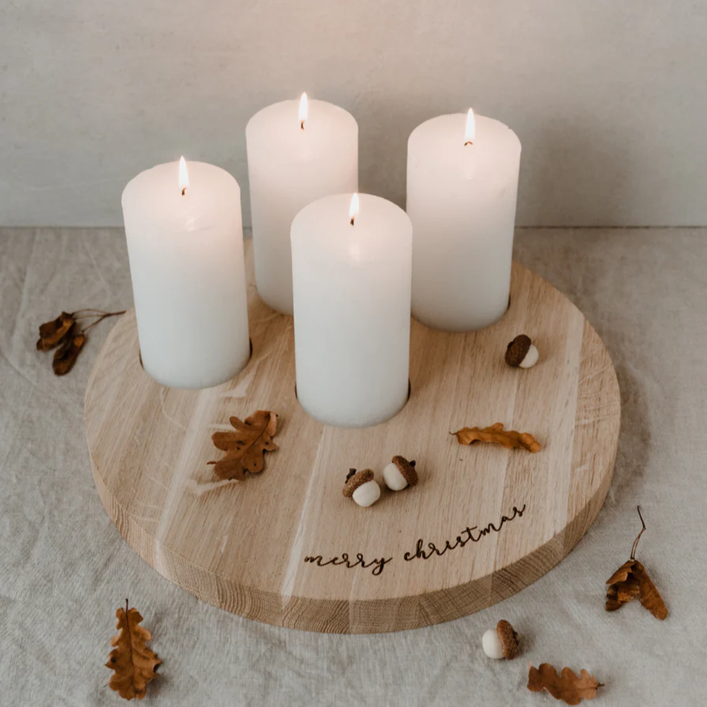 Dit kaarsenplateau is gemaakt van hoogwaardig eikenhout met veel aandacht voor detail. Het biedt ruimte voor vier blokkaarsen en nodigt je uit om je decoraties te personaliseren. Als blikvanger op het dressoir of als puristische versie van de adventskrans - een heel bijzonder favoriet stuk voor de mooiste tijd van het jaar.