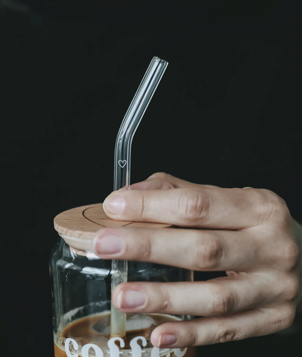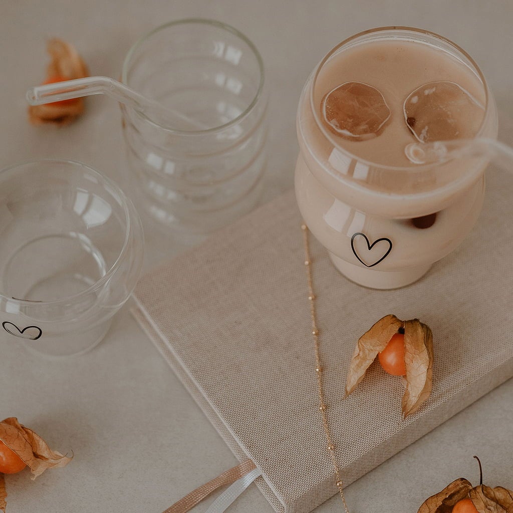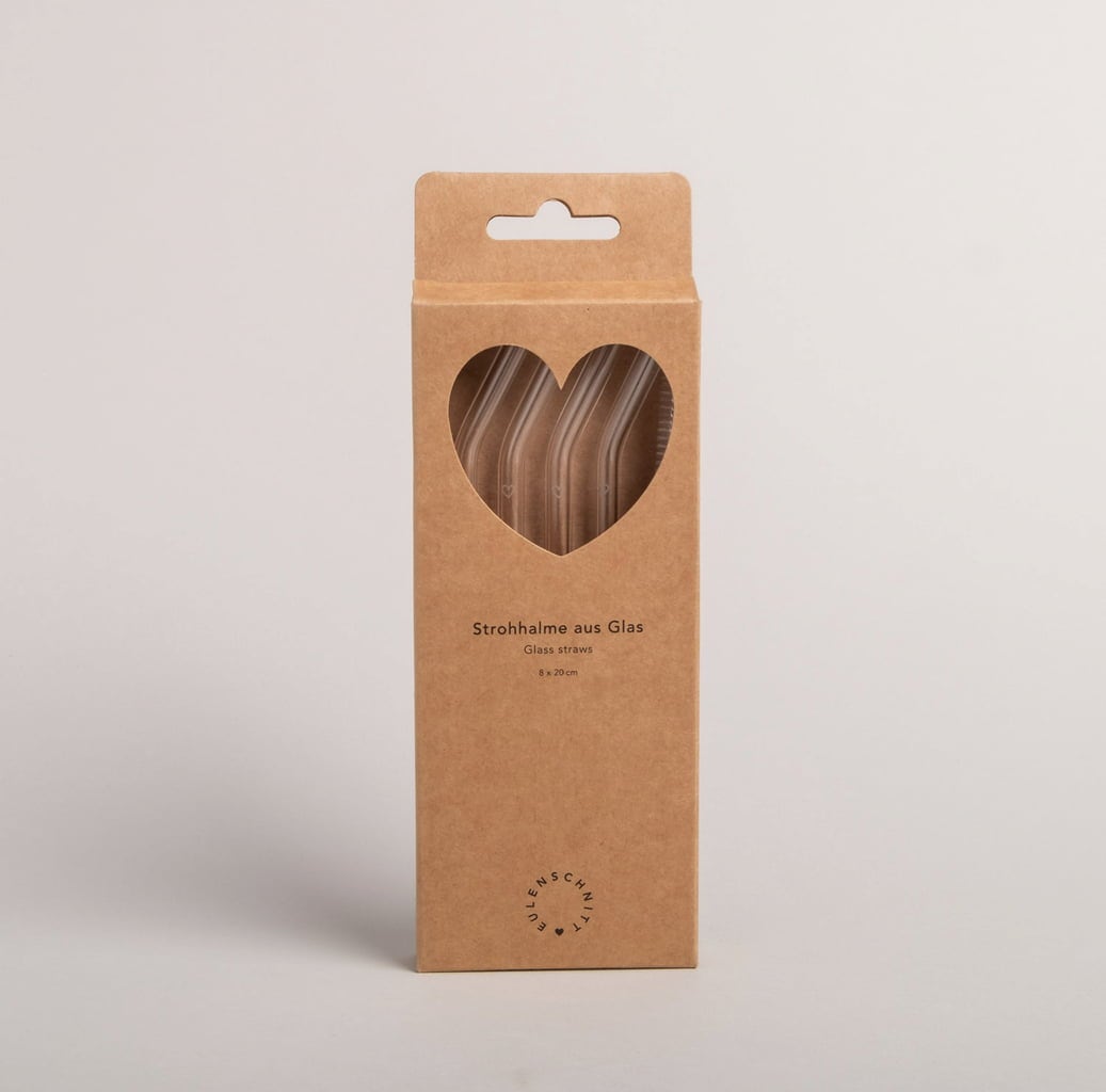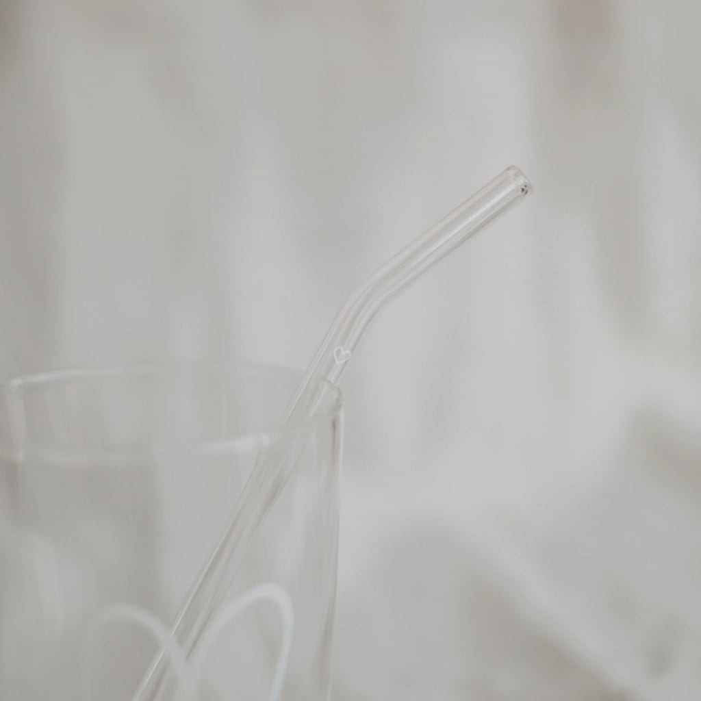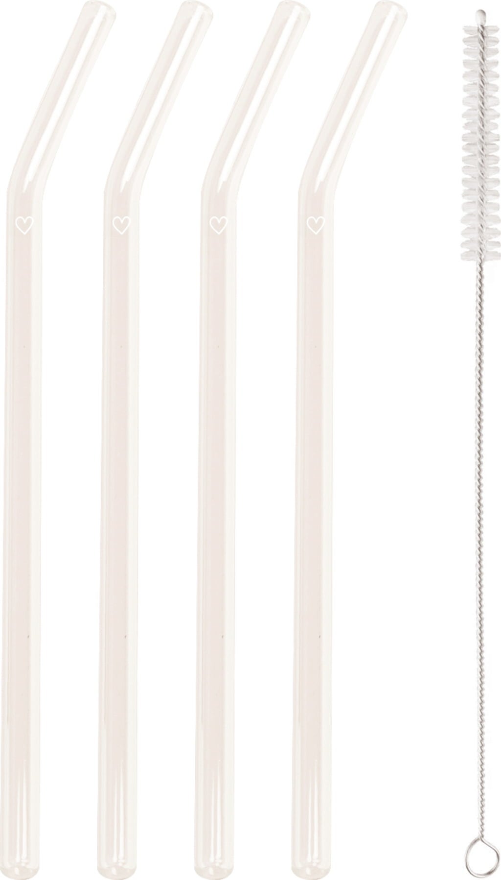 Hittebestendige rietjes van borosilicaatglas met gegraveerd hart. De rietjes kunnen in de vaatwasser of met de meegeleverde borstel worden gereinigd.