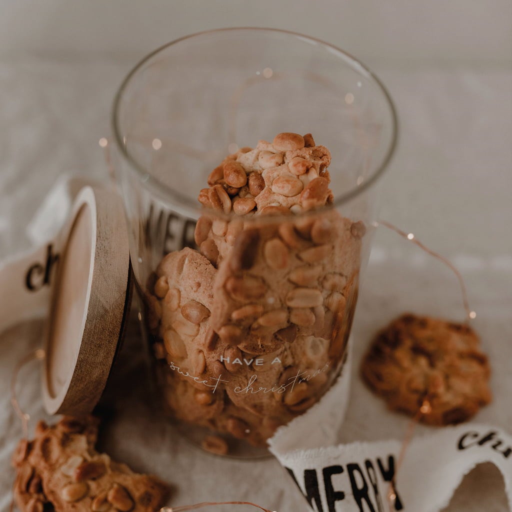 Praktisch en mooi! Deze pot is gemaakt van hoogwaardig borosilicaatglas en is versierd met een eenvoudig ontwerp in witte opdruk. De deksel van acaciahout heeft een siliconen ring die zorgt voor een luchtdichte afsluiting wanneer gesloten - houdt de inhoud langer vers.