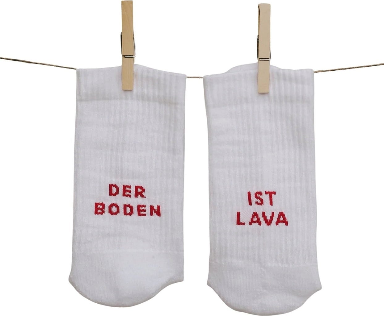 Als cadeau of voor jezelf - deze witte sokken met rode details brengen jeugdherinneringen en comfort terug in je dagelijkse leven. De slogan "Der Boden ist Lava" op de achterkant zal je in een goed humeur brengen, terwijl verstevigde zones en een zachte boord zorgen voor een hoog comfortniveau.