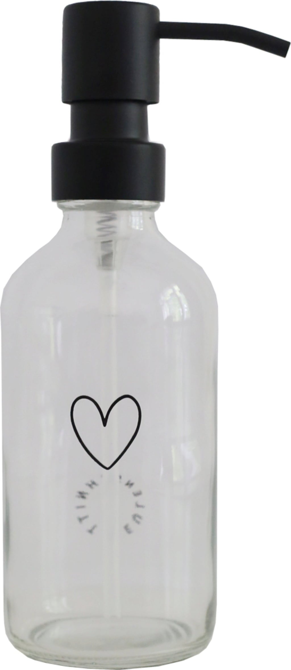 Discreet, teruggebracht tot het essentiële en erg mooi. De zeepdispenser van transparant glas met een zwarte hartprint en metalen pompdop is niet alleen praktisch en duurzaam, maar maakt ook indruk met zijn eenvoudige look. Dankzij de meegeleverde schroefdop kan de fles gemakkelijk worden vervoerd en worden bijgevuld.
