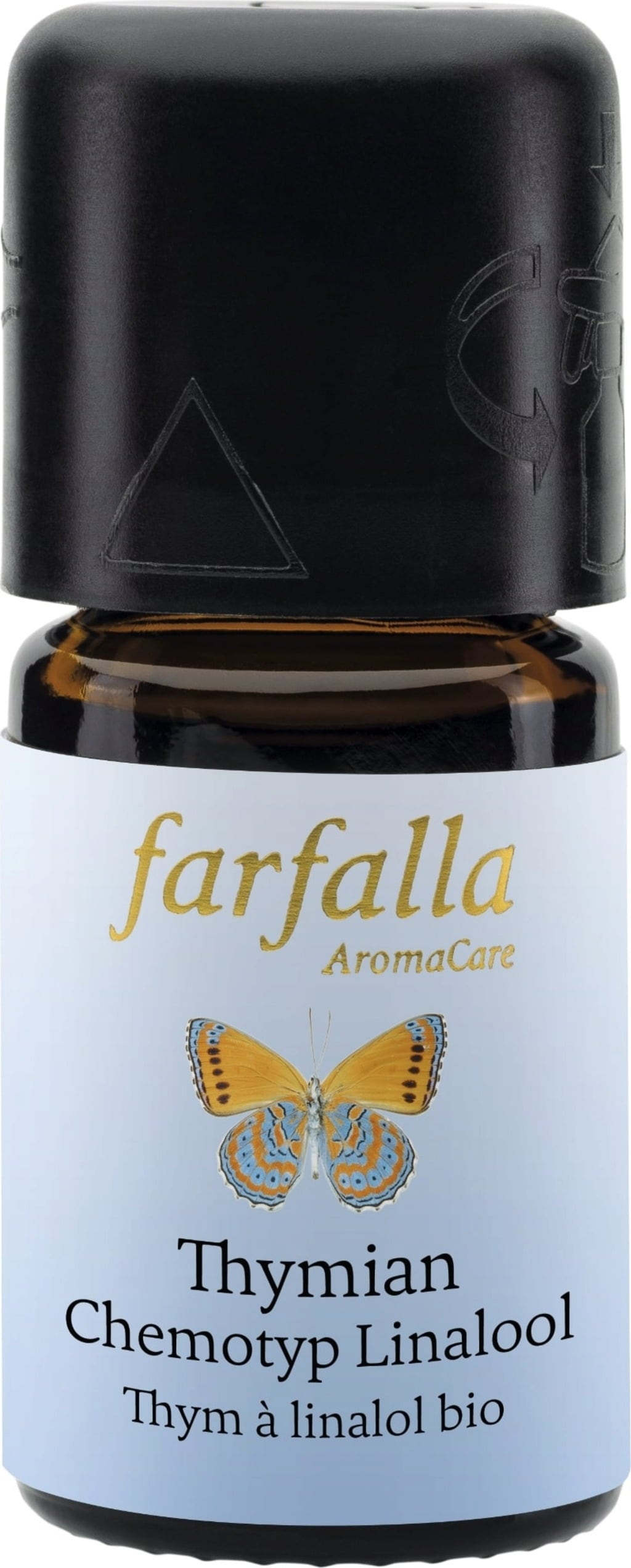 Tijm houdt van veel zon en stenige bodems en groeit in het wild rond de Middellandse Zee. Monniken cultiveerden tijm in hun kloostertuinen vanwege de vele helende eigenschappen. Tijm is vooral effectief bij aandoeningen van de luchtwegen, maar ondersteunt ook mentale vermogens en bevordert de concentratie. Farfalla verzamelt de wilde tijm voor deze essentiële olie in de Cevennen en Haute-Provence. Tijm linalol, geraniol en thujanol worden beschouwd als milde tijmvariëteiten.