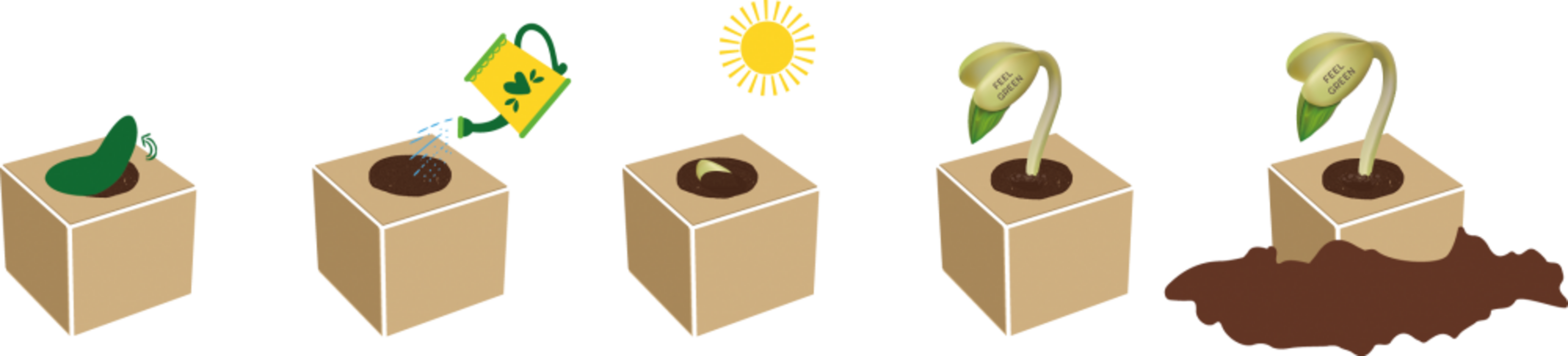 Je verwijdert de sluitingssticker van de kubus, geeft hem een ​​beetje water en legt hem vervolgens op een lichte, warme plaats. Na een paar dagen komt de berichtenkubus tot leven en begint er een kleine sperzieboon met een felicitatie erin gegraveerd uit de eco-kweekset te ontkiemen.