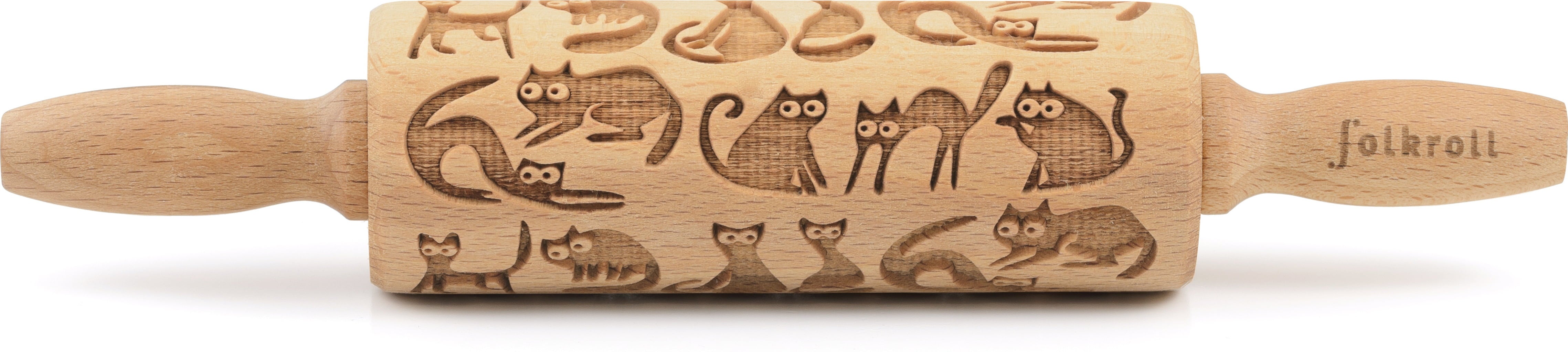 Talrijke katten in een cool stripmotief ravotten rond op deze gegraveerde deegroller. In een handomdraai maakt hij prachtig versierde koekjes en biscuits waar je geen genoeg van kunt krijgen. Het gebruik is heel eenvoudig: rol over het uitgerolde deeg en snijd vervolgens naar hartenlust uit met een deegsnijder of met uitsteekvormpjes, bakken, klaar!