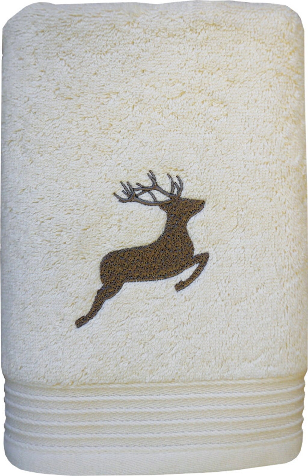 De knusse, zachte en absorberende handdoek biedt optimaal comfort bij het afdrogen en het tijdloze design zorgt voor elegante accenten! Je huid zal geen genoeg kunnen krijgen van deze 100% katoenen handdoek! De handdoek met het motief van een springend hert geborduurd in bruin op badstof zorgt voor een gezellige sfeer in de badkamer.