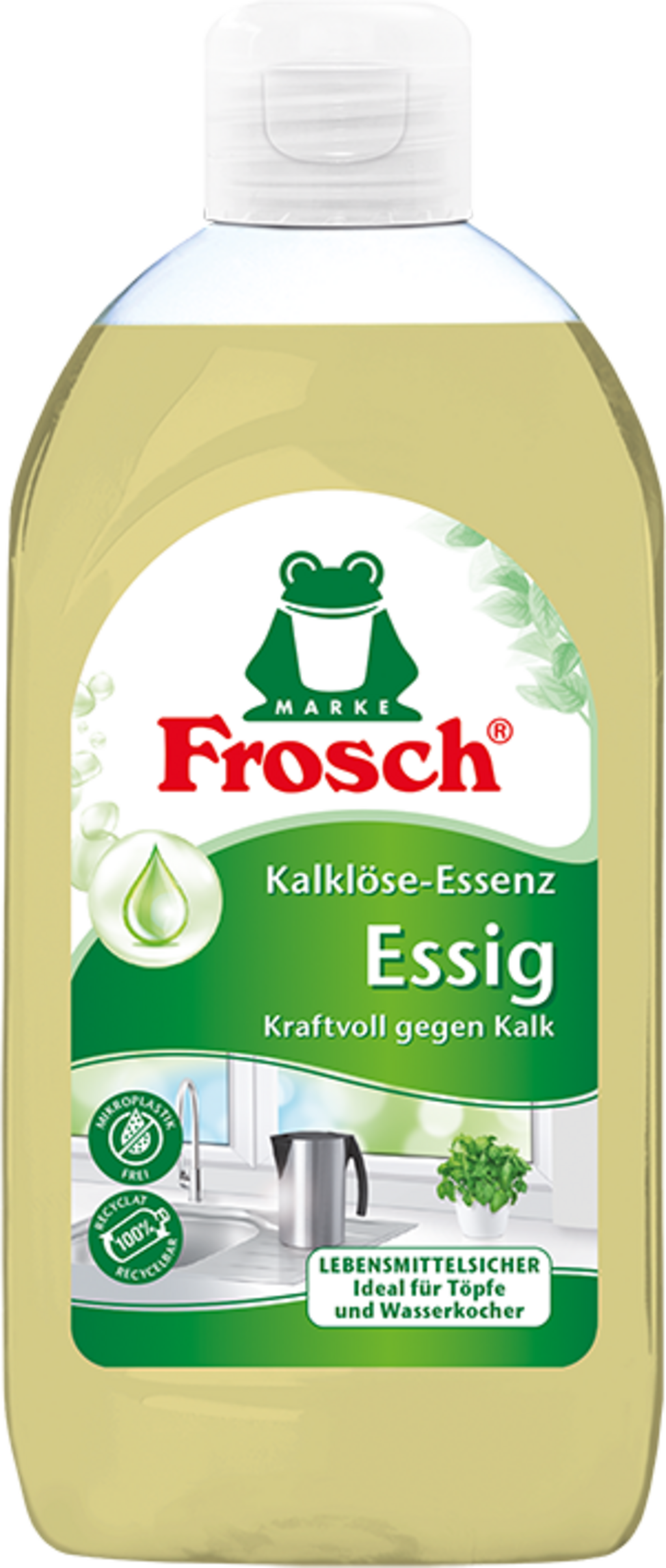 De sterk geconcentreerde Kalkverwijderaar-Essence Azijn van Frosch bevat fruitazijn en zorgt voor een grondige ontkalking in keuken en badkamer!