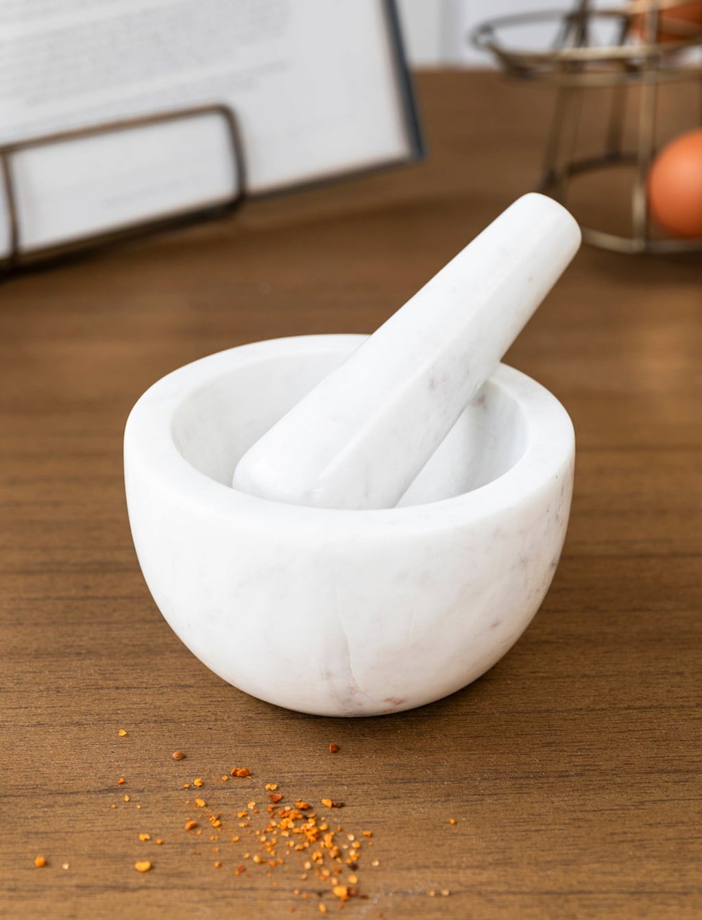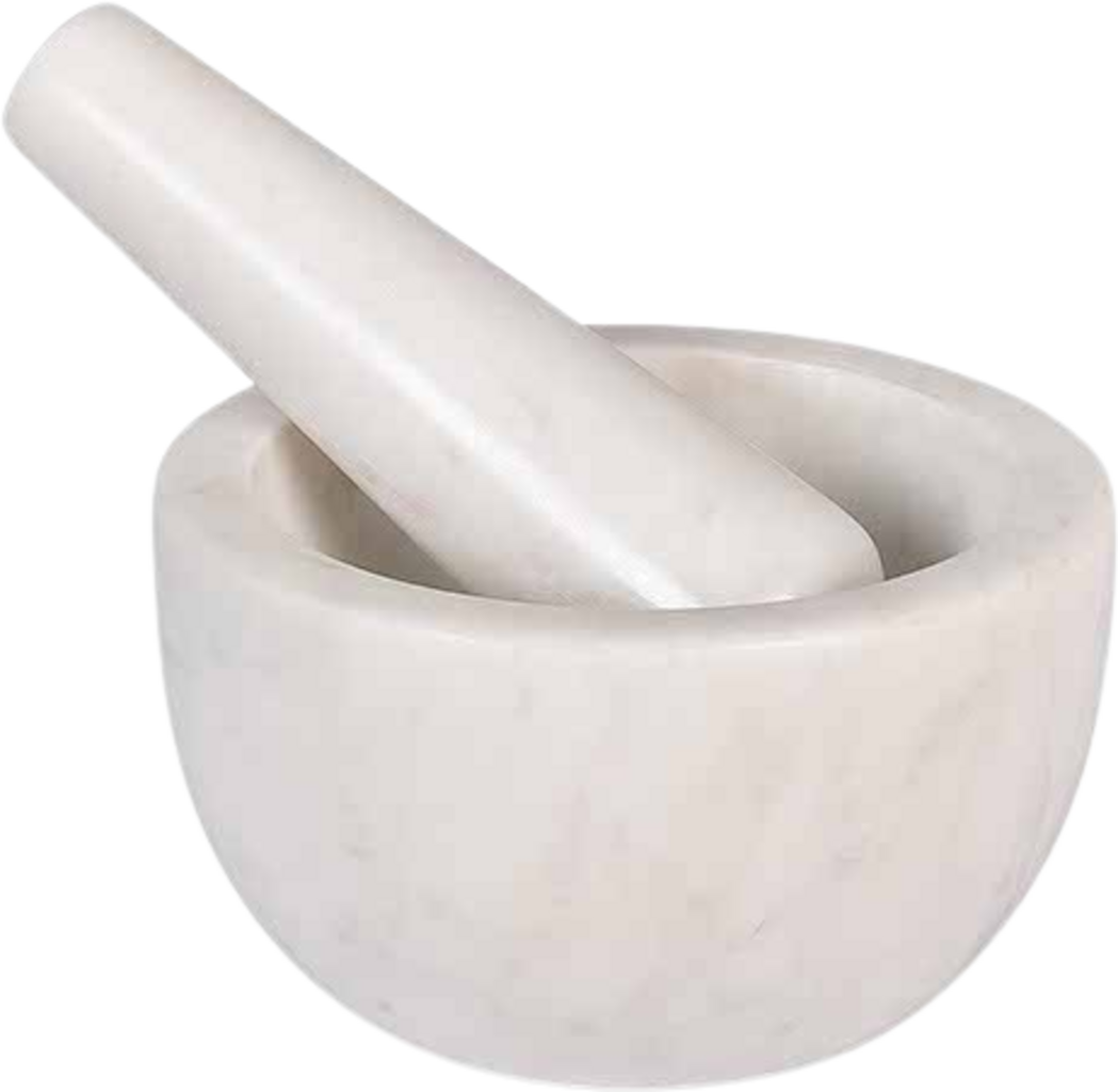 De Brompton vijzel en stamper is gemaakt van fijn wit marmer en is een elegante aanvulling op elke keuken. Het maakt het malen van kruiden en specerijen tot een waar genoegen en siert elke keuken.