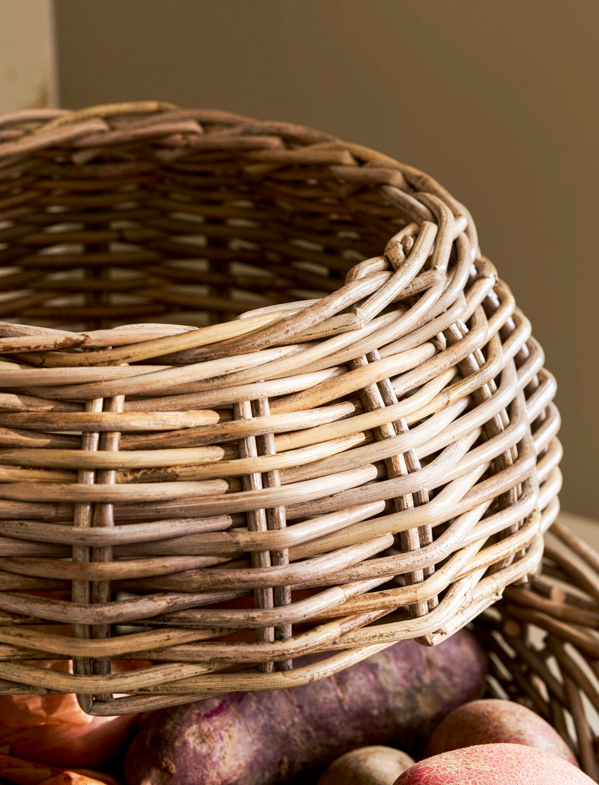 Perfect voor een gezellige landelijke keuken: deze groentemand is ideaal voor het bewaren van groenten zoals aardappelen, uien en wortelen. Handgevlochten van rustiek rotan is het een visuele aanwinst voor elke voorraadkast of keuken.