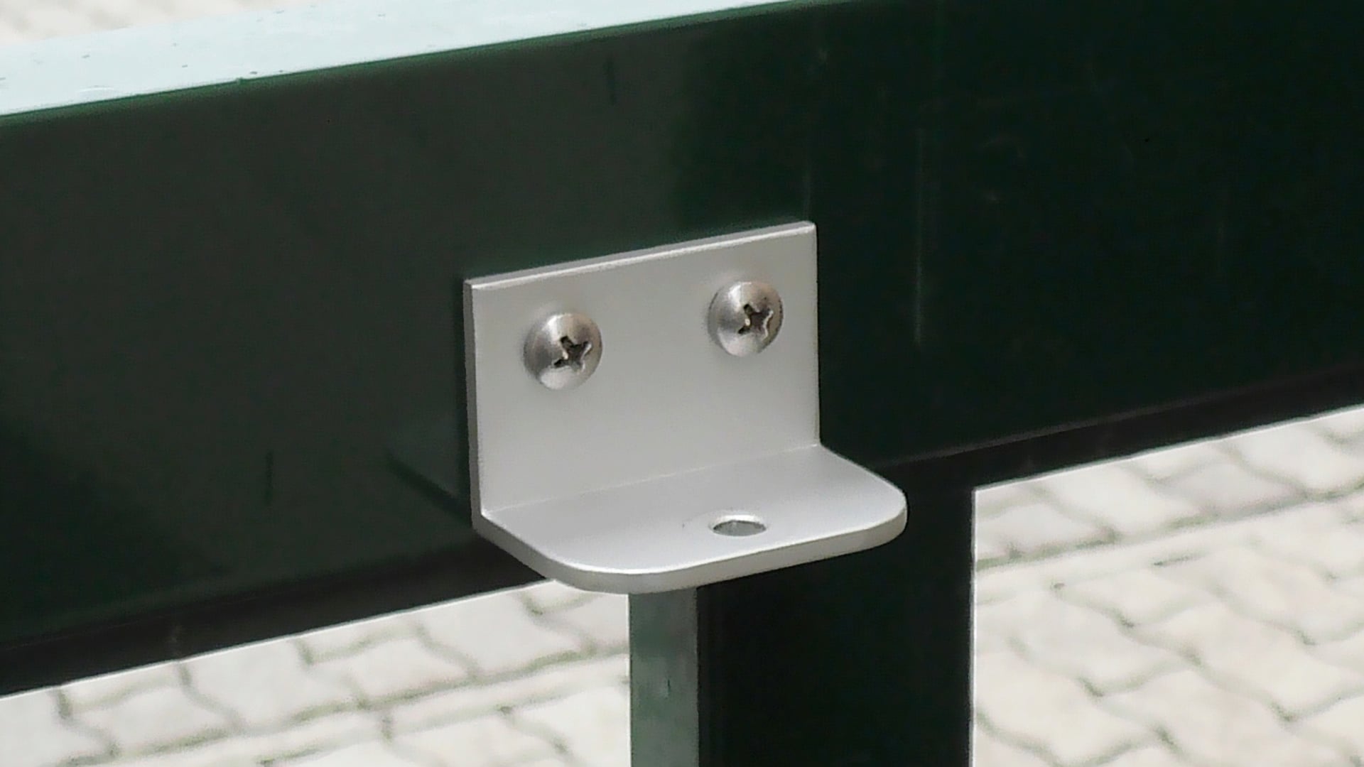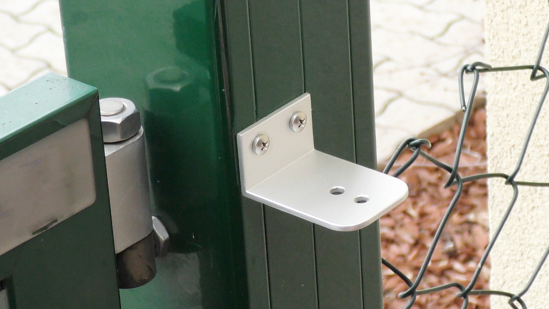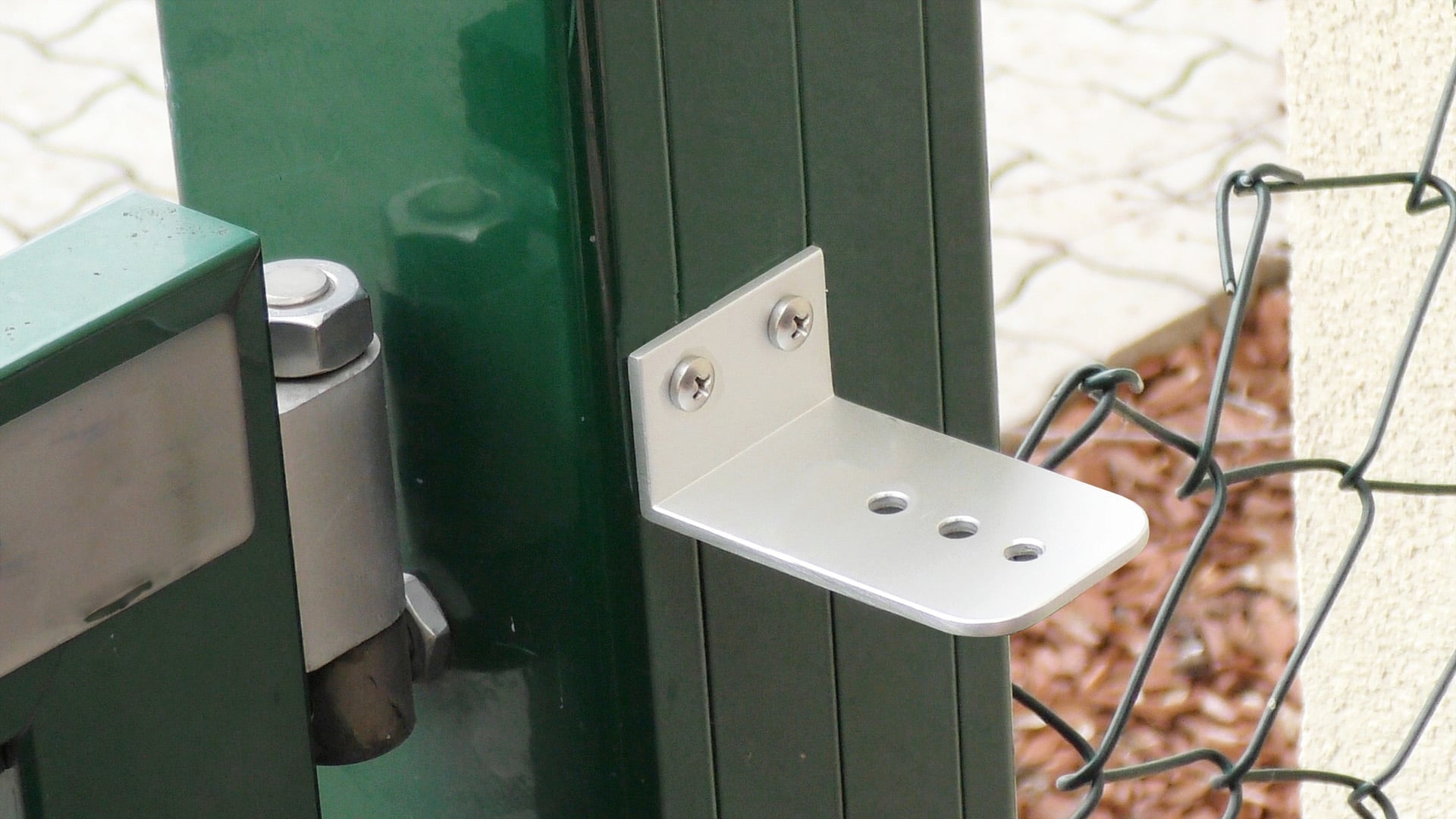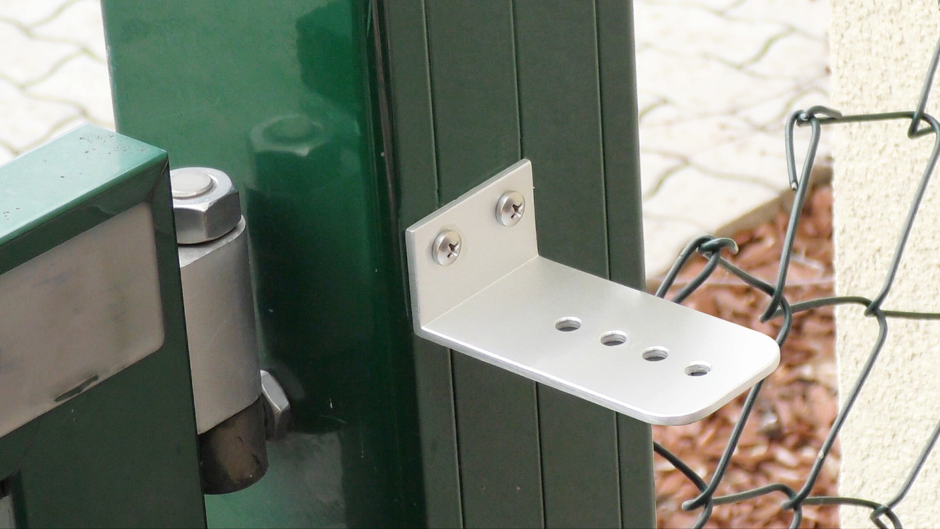 De sluiter wordt gemonteerd met behulp van slechts twee beugels en vier schroeven en is in slechts een paar stappen en korte tijd klaar. Hij past op alle rechthoekige hekpalen en kan ook aan de muur worden bevestigd.